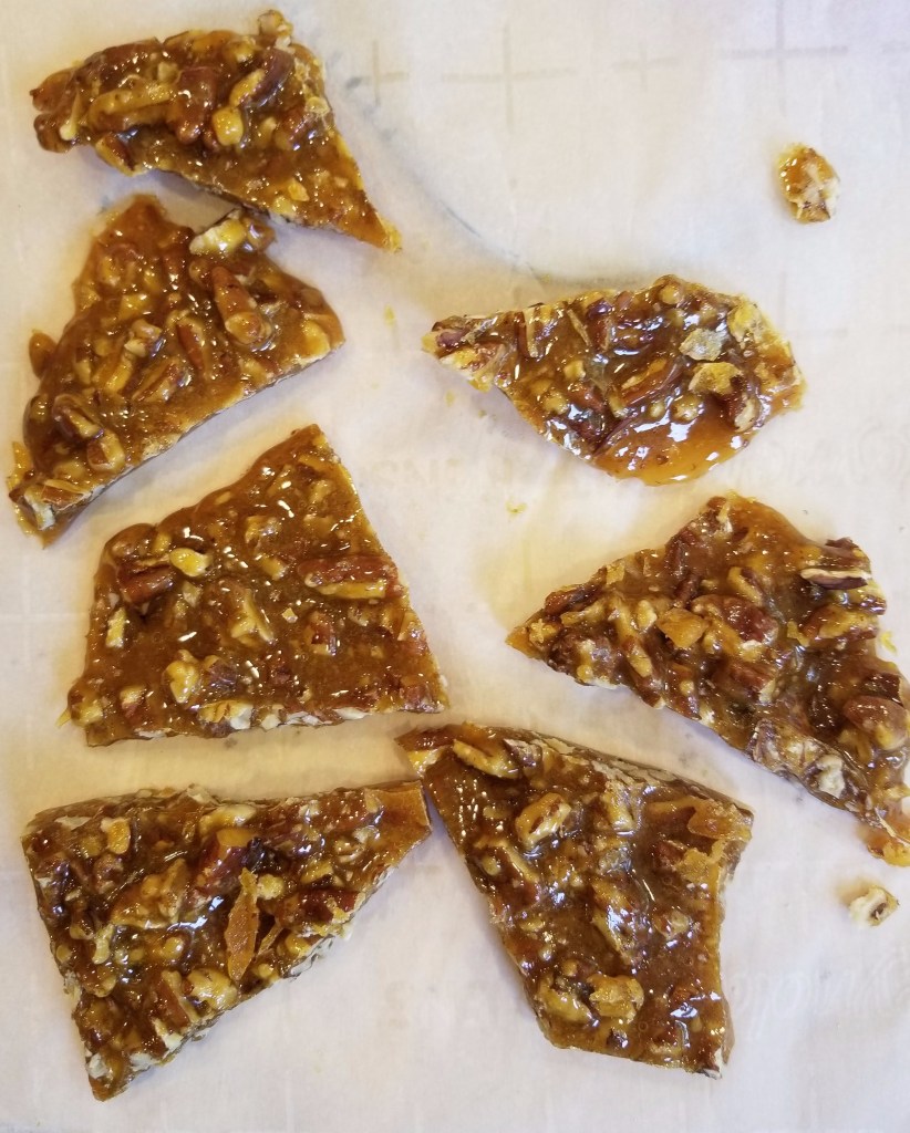 - Immediately pour melted sugar over pecans on parchment paper. Tilt pan to spread caramel in a thin layer. Cool completely, about 20 minutes.