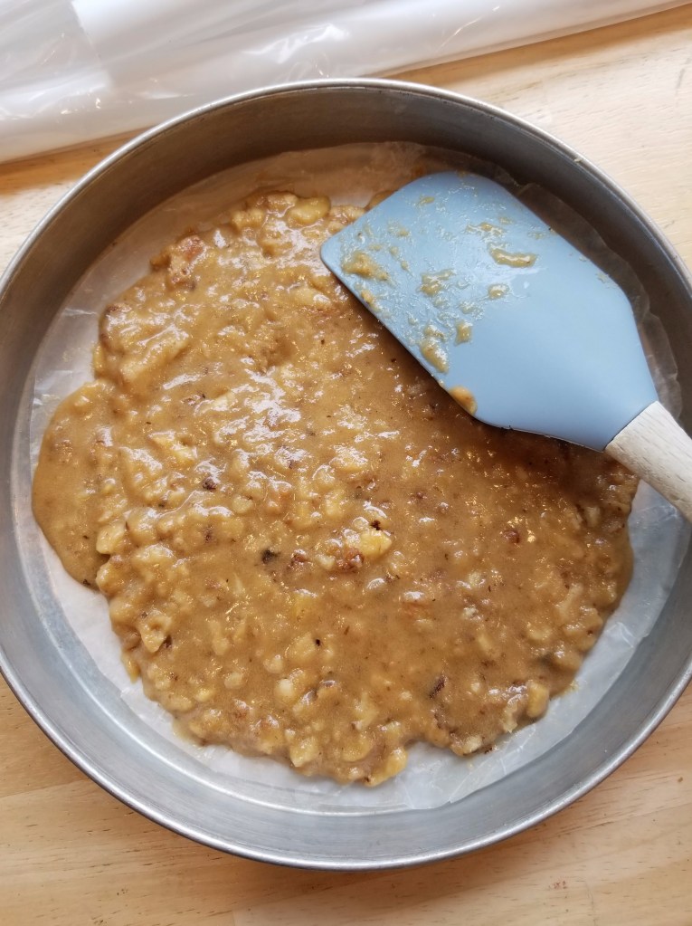 The coffee cake recipe is adapted from that of a U.K. baker I follow on Instagram, Thida Bevington. She makes coffee and walnut cakes every week (or did, before the pandemic hit) for a little volunteer-run tearoom in Norfolk, England, near where she lives. I could only find her recipe on her Instagram stories, but I see that the tearoom, North Lodge Park Café, offers a cookbook of some of their most popular offerings. Might be worth the cost of international shipping! I opted to omit the walnuts from the cake and put them in the filling instead, the recipe for which I found on TheSpruceEats.com. The chocolate ganache came from my go-to recipe, which I’ve used in my Chocolate-Orange Torte and my Goose That Laid the Golden Egg Cake.