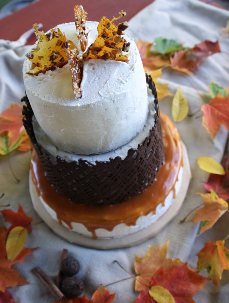 So I decided to give a hint of what was inside the cake by decorating the outside of each tier with an element of what it contained. The bottom tier, with its caramel apple filling, would get a salted caramel drip. The middle tier, with a chocolate ganache and walnut filling, would be adorned with a chocolate collar. The top tier, with its praline powder and coffee buttercream filling, would be topped with praline shards.