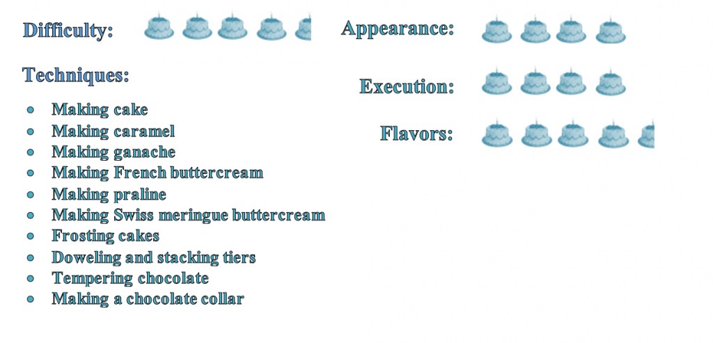 As always, I didn’t put the same time constraints on myself that the contestants had in the Great White Tent. True to form, it probably took me twice as long as the six hours they were given, and I spread it out over two days. I prepared the cakes and fillings the first day; then the second day I frosted, assembled and decorated the tiers.