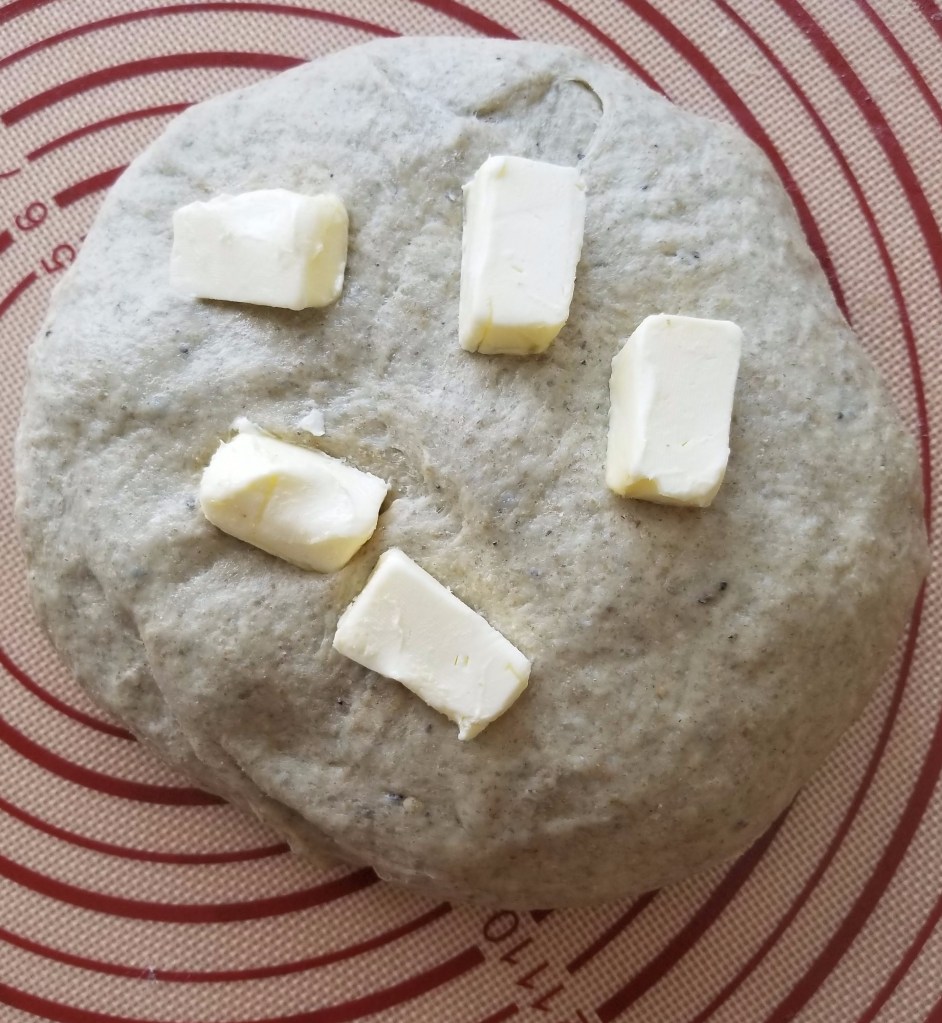 - After the dough is smooth, pat it out into a disc and put about a third of the butter onto it. Knead the dough again until the butter is absorbed. It will split and look greasy for a bit, but keep going. It will come together.
