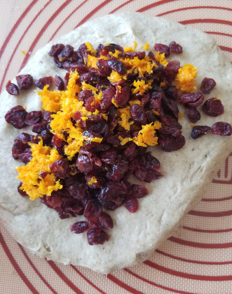 - The dough should now be soft and silky. Form it into a disc again and spread the cranberries and orange zest on top. Knead until the fruit is evenly distributed. Lightly grease the bowl that you mixed the dough in, pop the dough back into the bowl, cover it with a damp tea towel and leave it in a warm spot until doubled in size (about 1 hour).