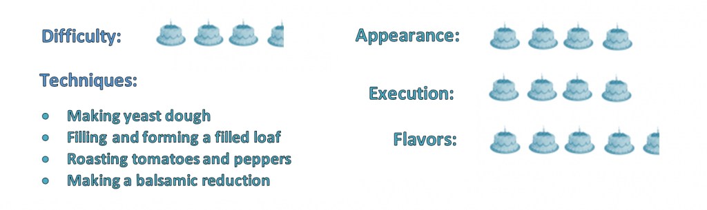 The brief for this showstopper challenge was to make a filled loaf. It could be stuffed, rolled, twisted, braided—you name it. But it had to look good as a centerpiece, too. After drooling over the creations of the bakers in the Great White Tent, like Luis’ roscón de Reyes and Kate’s prosciutto, olive and coriander braid, I settled on a tear-and-share featuring the Mediterranean flavors of my favorite pizza — pesto, artichoke hearts and roasted red peppers — with a side of roasted tomatoes, feta cheese and balsamic reduction.