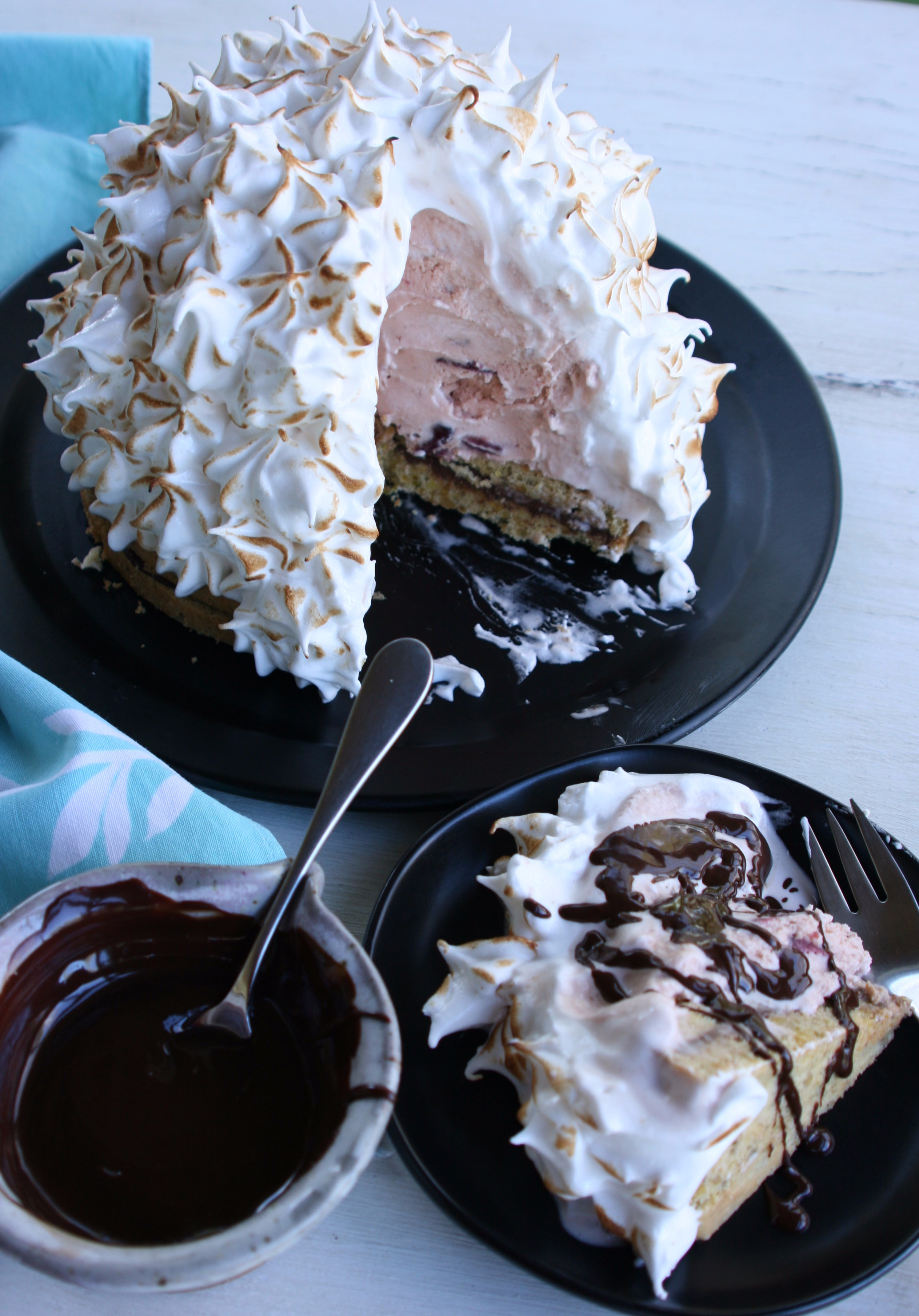 I served my Spumoni Baked Alaska with additional ganache, warmed up and drizzled over each slice. It was a hit with the friends I was able to share it with. This impressive dessert is sure to wow guests at a birthday party or any celebration. It takes cake and ice cream to a whole new level!