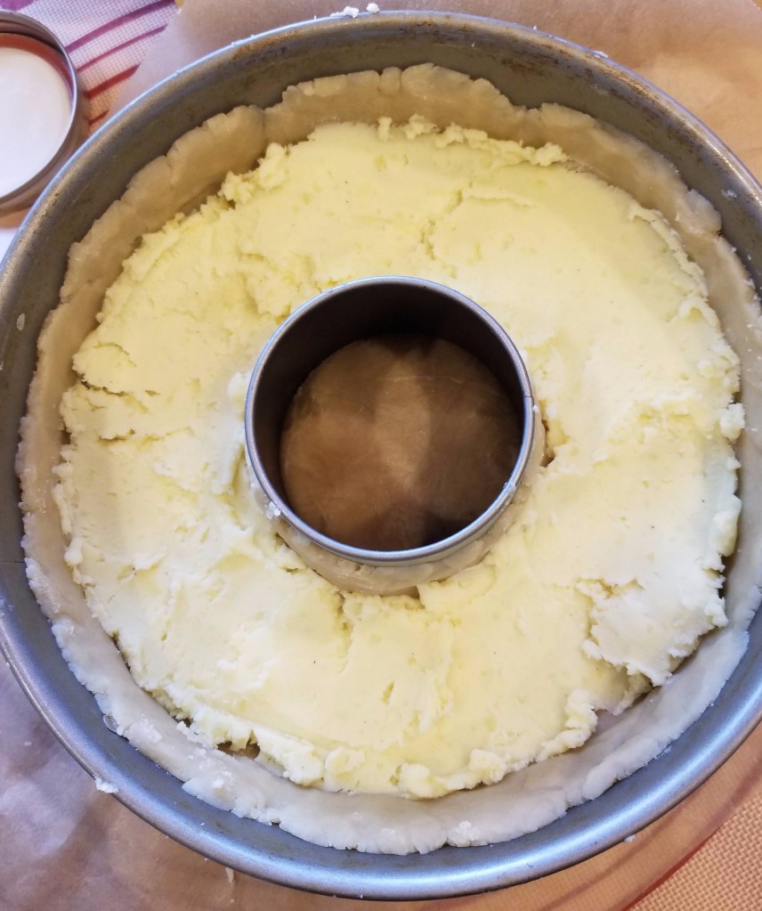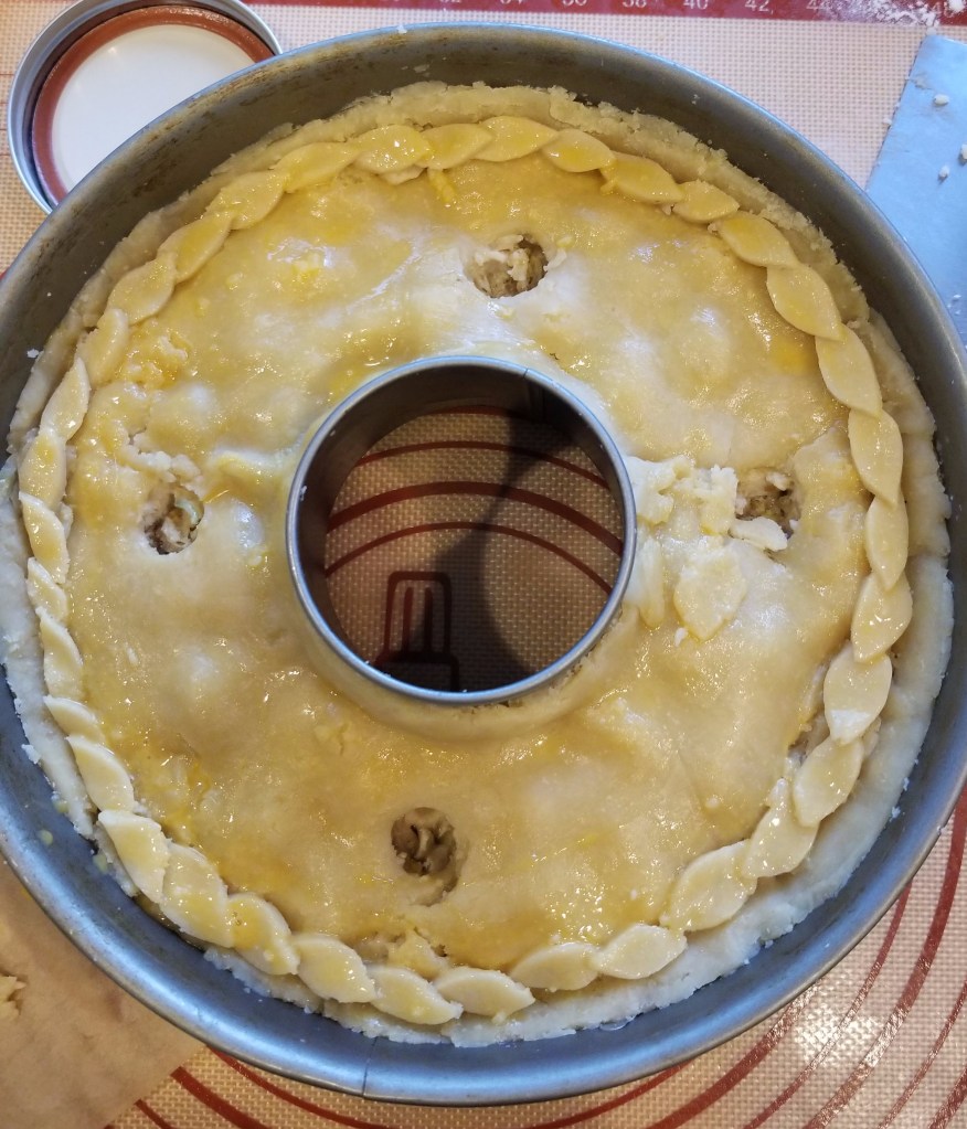 My turkey pie is an homage to a traditional American Thanksgiving. In fact, this is a great way to use up Thanksgiving leftovers. Using this recipe as the basis, I layered mashed potatoes (I add cream cheese to mine to make them creamier.), sage dressing (my mom’s recipe!), and turkey and gravy inside a hot water crust pastry–lined springform ring-cake pan. I figured the additional circle of crust in the middle would make the pie more structurally sound, able to support two pies on top of it. Lining a pan that has a hole in the middle with pastry proved difficult and in the end may not have been worth it. If you plan to make this pie, feel free to use a regular deep-dish springform pan if you like.