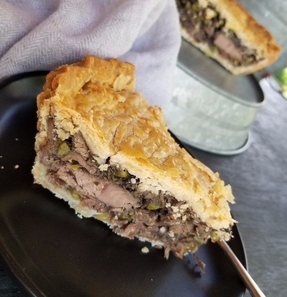 The duck pie recipe I borrowed from Sainsbury’s Magazine. It calls for braising duck legs in a red wine sauce with bacon, shallots and carrots, then removing the meat from the bones and stirring in peas and a few fresh mint leaves before covering it with shortcrust pastry and baking it. I subbed in hot water crust for this pie, too, knowing I would have to turn it out of the tin after baking it.