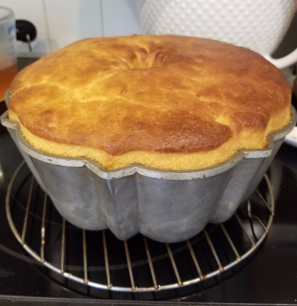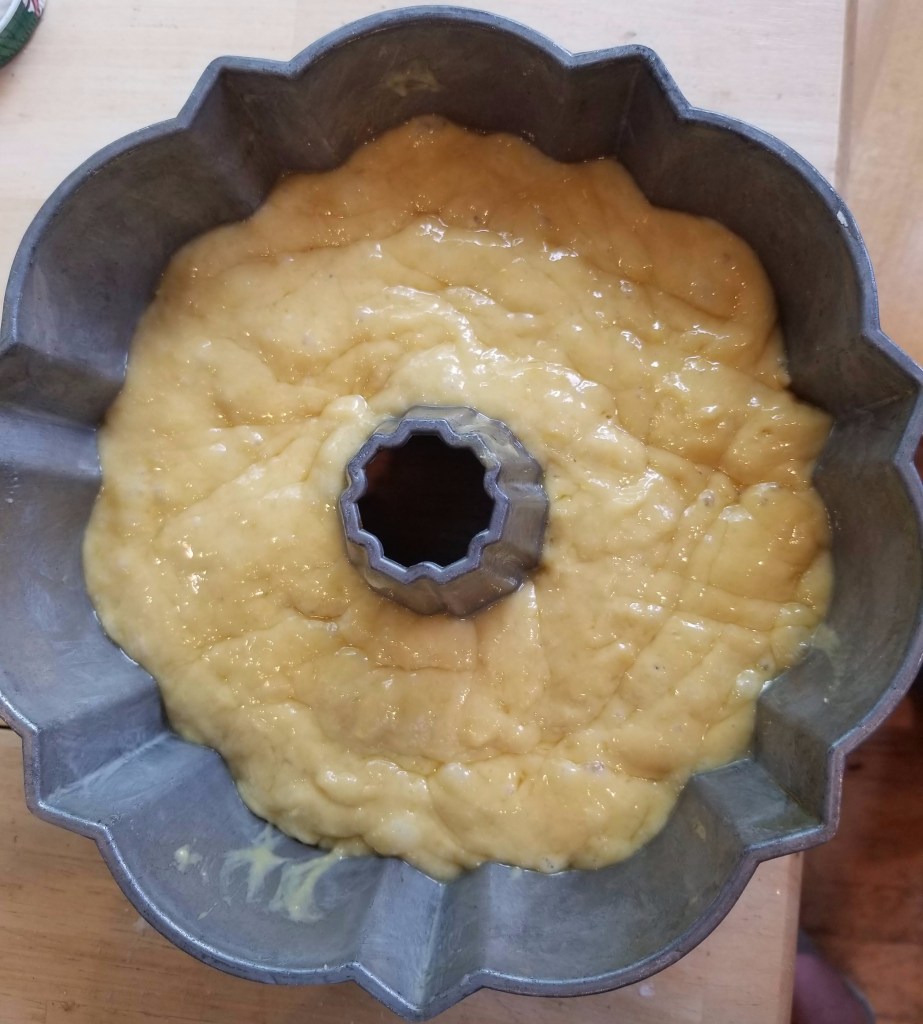 - Grease a 9-inch savarin mold or Bundt pan. (I use Nancy Birtwhistle’s lining paste recipe here: https://www.youtube.com/watch?v=PL5ydEOCSgE.) When the batter has risen, stir it down, then pour or spoon it into the prepared pan. Cover with greased plastic wrap and let rise for 25-45 minutes, until it fills three-quarters of the pan.