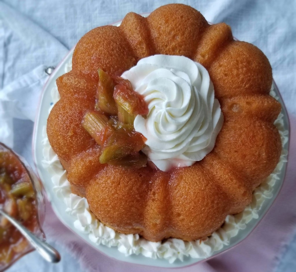 - While the savarin is baking, make the compote. Combine rhubarb and ¾ cup sugar in a saucepan over low heat. Cook for about 5 minutes, until rhubarb starts to soften but before it falls apart. Use a slotted spoon to transfer rhubarb to a bowl. Cook remaining liquid until it thickens to a syrup, about 5 more minutes. (If your rhubarb is not very red, you may want to add a few drops of red food coloring to make they syrup pink.) Pour syrup over rhubarb and let cool. (You may add reserved rhubarb and liquid from making the soaking syrup if you like.)