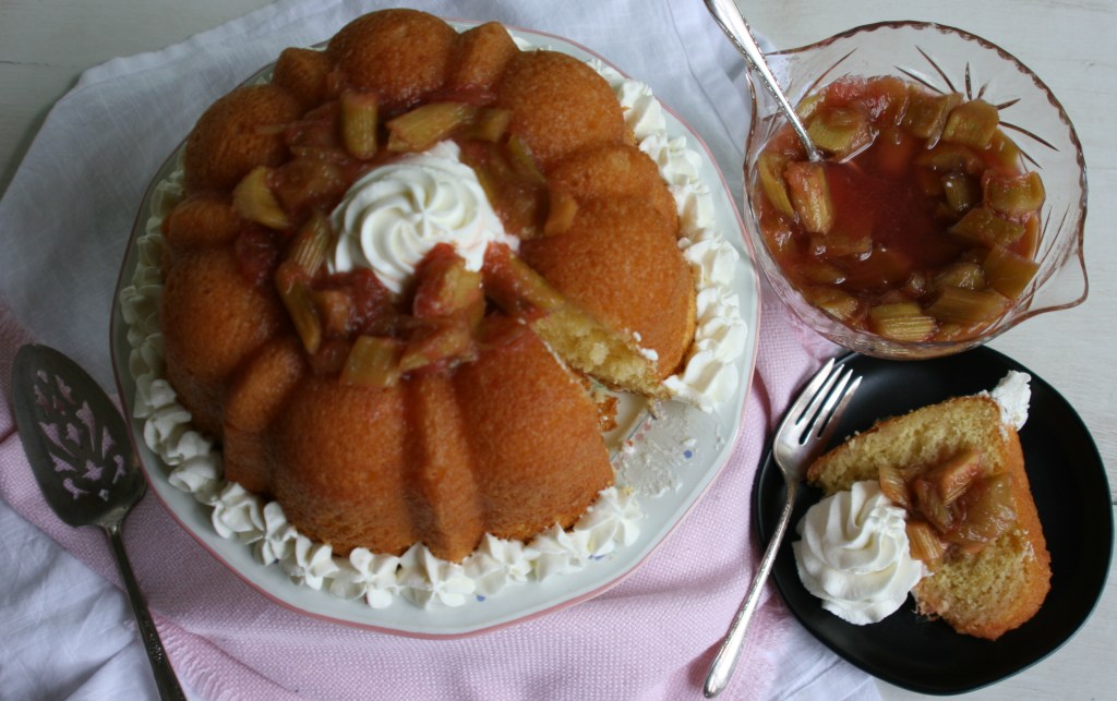 I made the soaking syrup by roasting fresh rhubarb sprinkled with sugar, elderflower cordial and lemon zest. I then added the resulting liquid to more elderflower cordial and simmered it down to a syrup. When the cake was done, I took it out of the pan, poured about half the syrup into the pan and carefully put the cake back in the pan to soak up the syrup. I also poked holes in the top of the cake and poured the rest of the syrup over the surface, allowing the syrup to soak in.