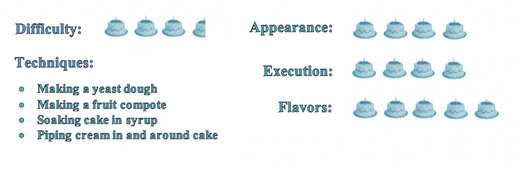 This signature challenge was for an old-fashioned, European-inspired yeast-leavened cake. Fillings and decorations were left up to the bakers. Chetna, Nancy and Martha all made savarins with various flavored syrups and fillings, Luis made a Kugelhopf, Richard made a Gugelhupf, and Kate made a babka.