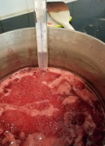 The next step was to make the jam. This is also fairly easy, but it helps if you have a candy thermometer so you’ll know when your fruit reaches the jelly stage (220°F). Mary’s recipe calls for jam sugar, which is hard to find in the U.S. It’s basically sugar with pectin already in it, so I looked at the recipes in my box of Sure-Jell pectin and used the amount it called for based on the amount of sugar in Mary’s recipe. In this case, I used 1¼ teaspoons of pectin to a little over 1 cup of sugar.