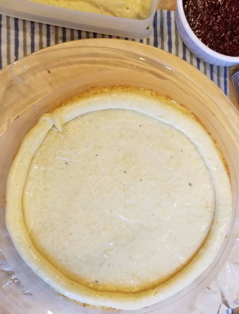 Did I mention we were having a heat wave? By this time, my layers were beginning to slide off of one another. The recipe said to refrigerate it for an hour, but I was running out of time, so I popped it in the freezer instead. This felt like a real Great British Bake Off moment!