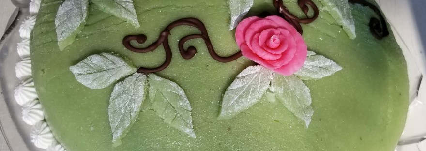 I rolled out the marzipan and covered it with plastic wrap to keep it from drying out while the cake chilled. Although my marzipan was perfectly smooth when I rolled it over my rolling pin to transfer it to the cake, it formed cracks and wrinkles during the transfer process, so half of my cake was smooth and the other half was cracked. Thinking quickly, I cut a bunch of leaf shapes out of the excess marzipan I had cut off around the bottom of the cake and used those to cover the cracks and wrinkles. I then piped a chocolate vine connecting the leaves to one another and, ultimately, the fondant rose.
