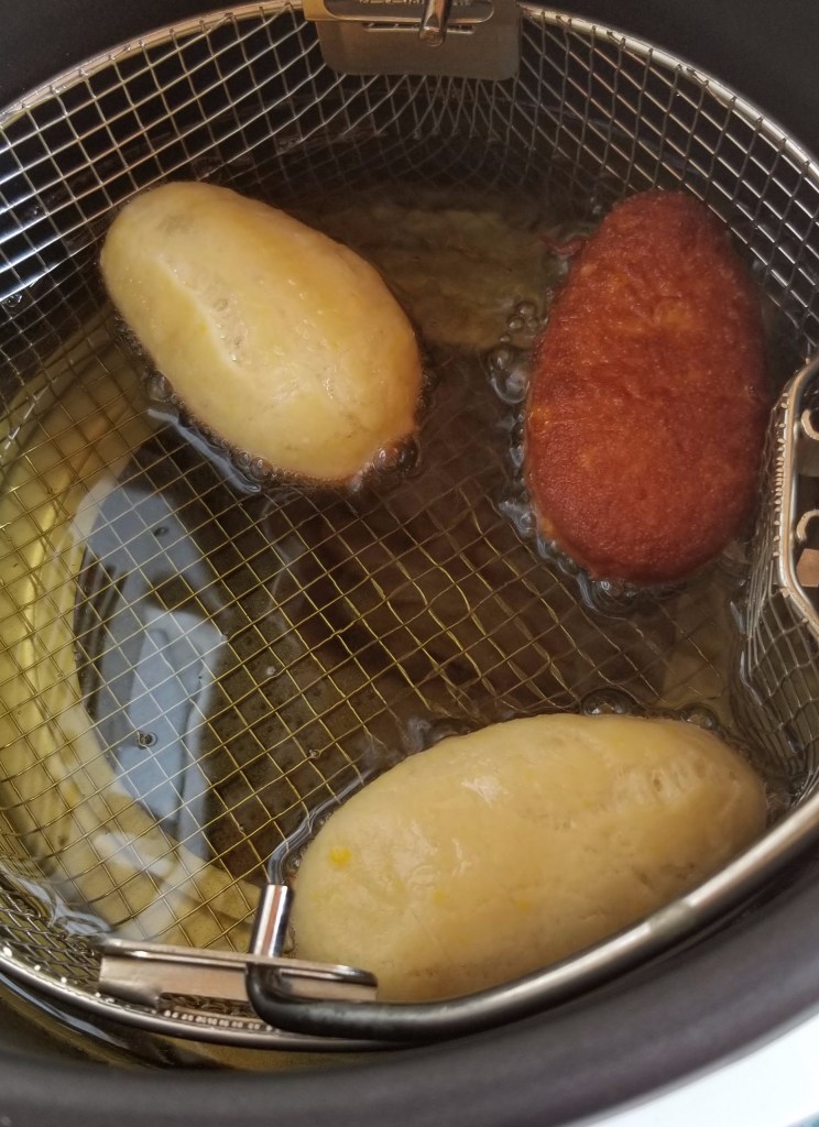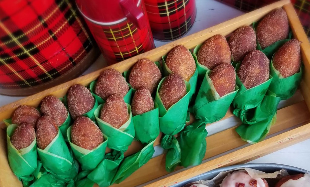 While the maple-bacon doughnuts are shaped like traditional circle-with-a-hole-in-the-middle doughnuts, I tried making the corn-and-applesauce doughnuts more in the shape of an ear of corn. I actually used a carrot-shaped cookie cutter that I’ve used for cookies at Eastertime, except I cut off the “carrot-top.” After frying, rolling them in cinnamon and sugar, and filling them, I wrapped them in green tissue paper cut to look like corn husks.