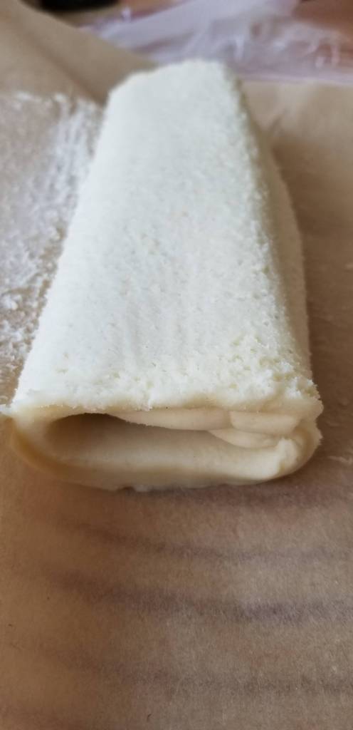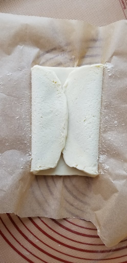 - To make the butter layer, cream the butter and flours together using an electric mixer. Sandwich the mixture between two sheets of plastic wrap and roll out to a rectangle about 5 inches wide by 10 inches long. Chill in the fridge for 25 minutes.