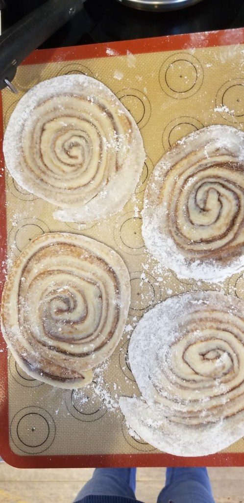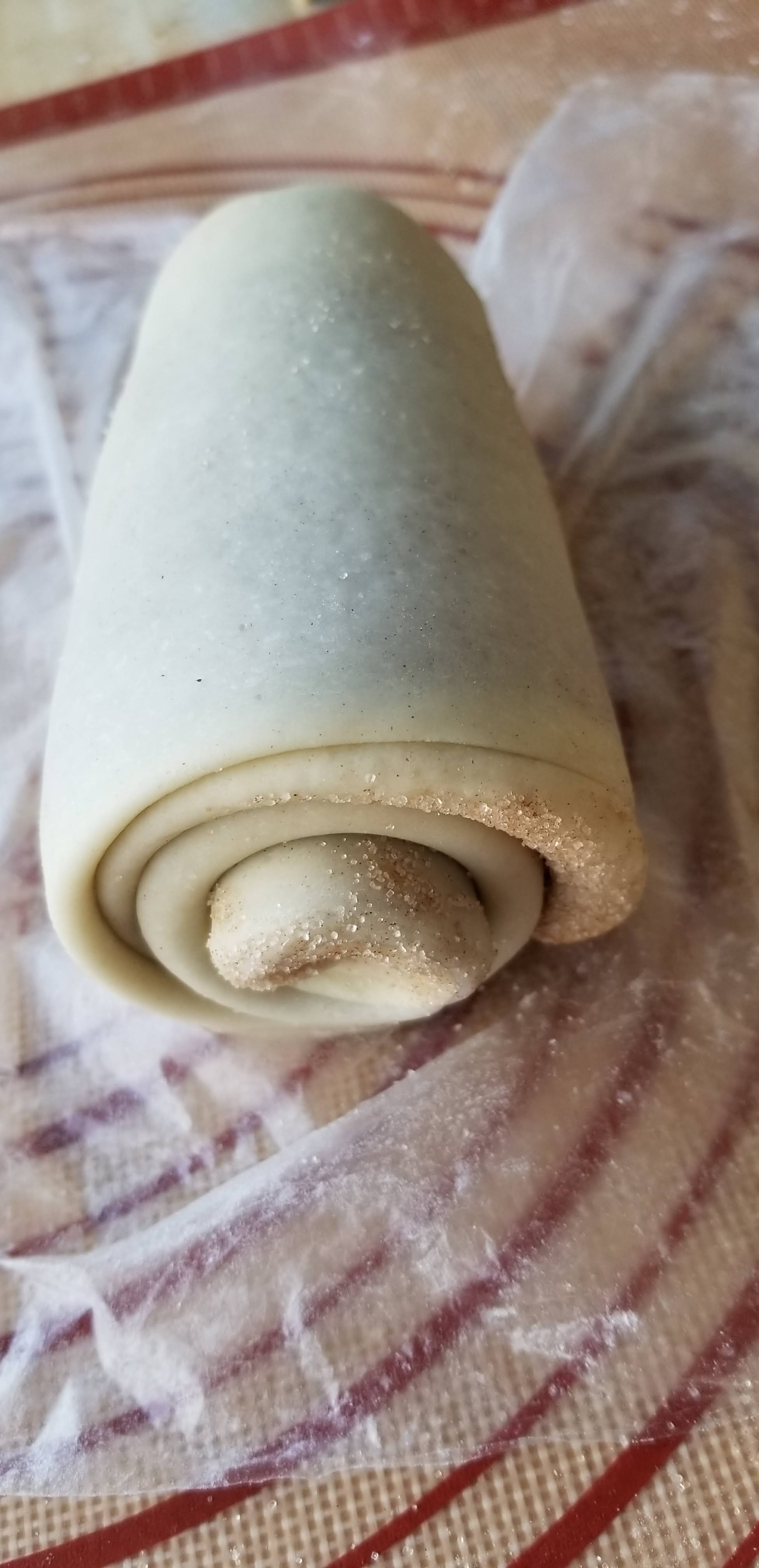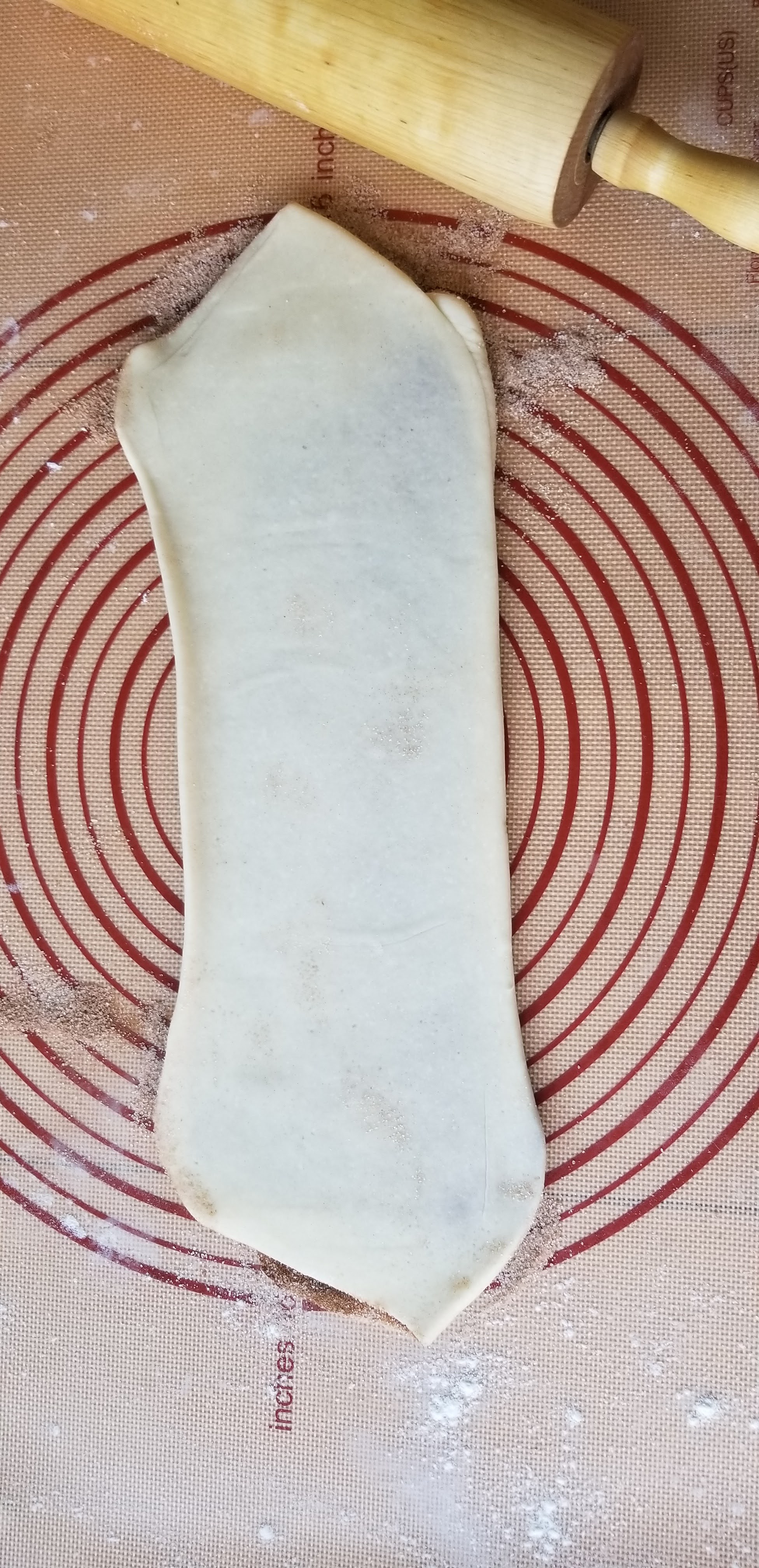 - For the filling, mix the granulated sugar and cinnamon together in a bowl. On a lightly floured surface, roll out the pastry to a rectangle, as before, and sprinkle the cinnamon-sugar over it. Make another book turn to incorporate the cinnamon-sugar, then roll out the pastry into a rectangle that’s 4½ by 8 inches and about ½-inch thick. Roll up the pastry from the short end like a Swiss roll. Wrap in plastic wrap and chill for 25 minutes.