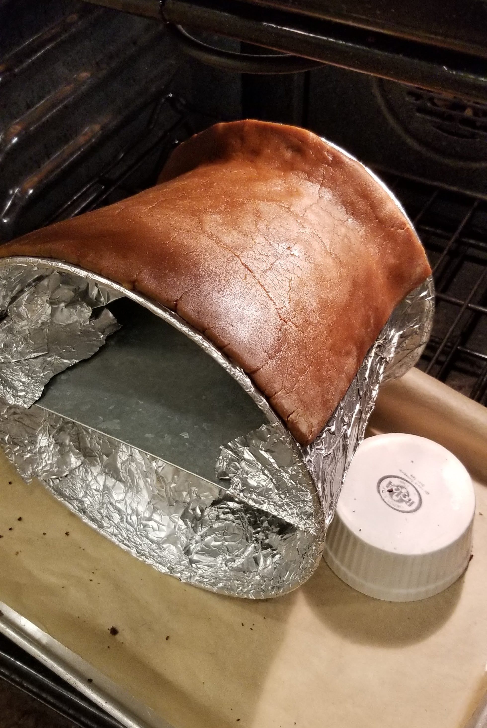 For the base of my hat, I found an ovenproof plate that was slightly larger than the bottom of the hat. The sides of the plate sloped upward like the brim of a hat. So I covered the plate in foil as well and laid a piece of gingerbread on top, cutting it to fit.