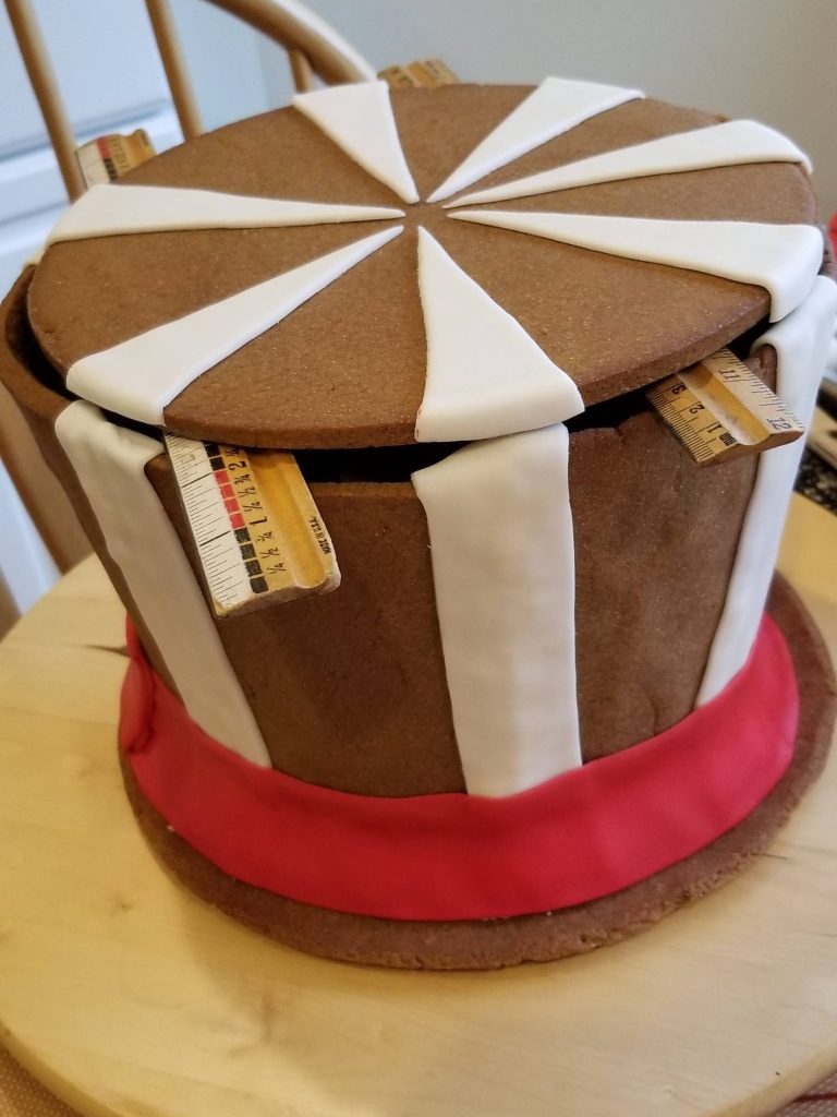Once the remaining pieces were cut to fit, I glued them together with royal icing, doing my best to keep my hat/box as close to a circle as possible. I left the whole thing to dry overnight. The next day, I used the leftover icing to glue the “brim” to the bottom of the hat. I then rolled out some white fondant and cut strips to cover the seams, adding a few more strips in between so they would be approximately evenly spaced. Then I put a red fondant hat band around the base, just above the brim. To make the lid coordinate with the rest of the hat, I added matching strips that came to a point in the middle and topped it with a big red fondant button in the center. For the finishing touches, I stuck a fondant “card” that reads “10/6” in the brim, just like the Mat Hatter’s, and a tag made out of fondant on top that says, “Eat me,” like the cake that Alice finds (and eats) in Wonderland.