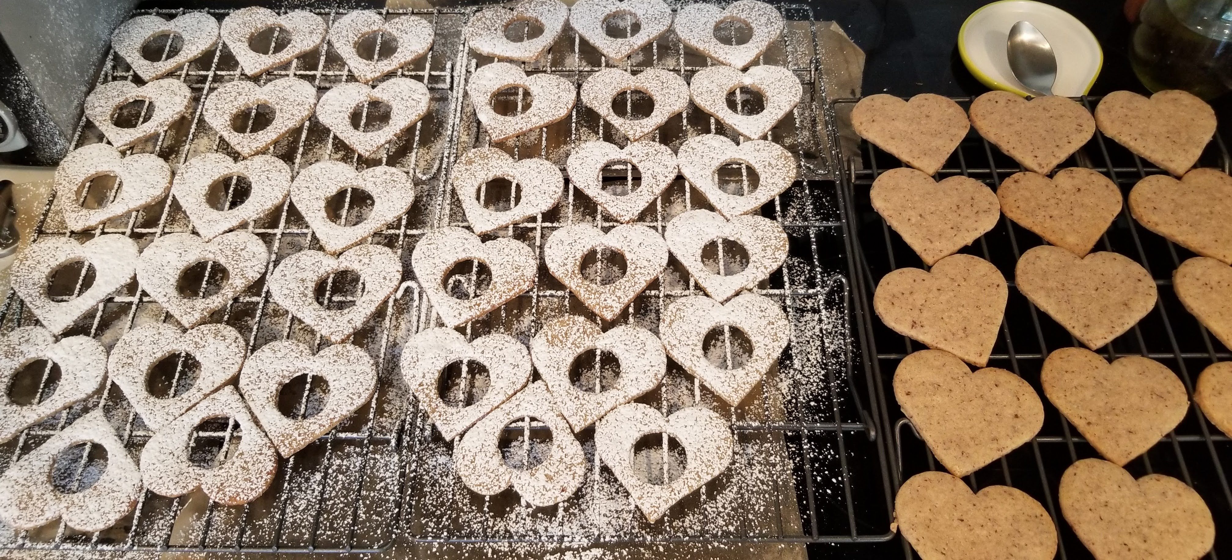 To fill my biscuit box, I made 36 Queen of Hearts Linzer Tarts, or Linzer cookies in the shape of hearts. Linzer cookies, sometimes called Linzer Augen (eyes) or Spitzbuben (“little rascals”), are descendents of one of the oldest known pastries, the Linzertorte. Dating from the mid-17th century, Linzertorte is closely tied to the Austrian city of Linz.