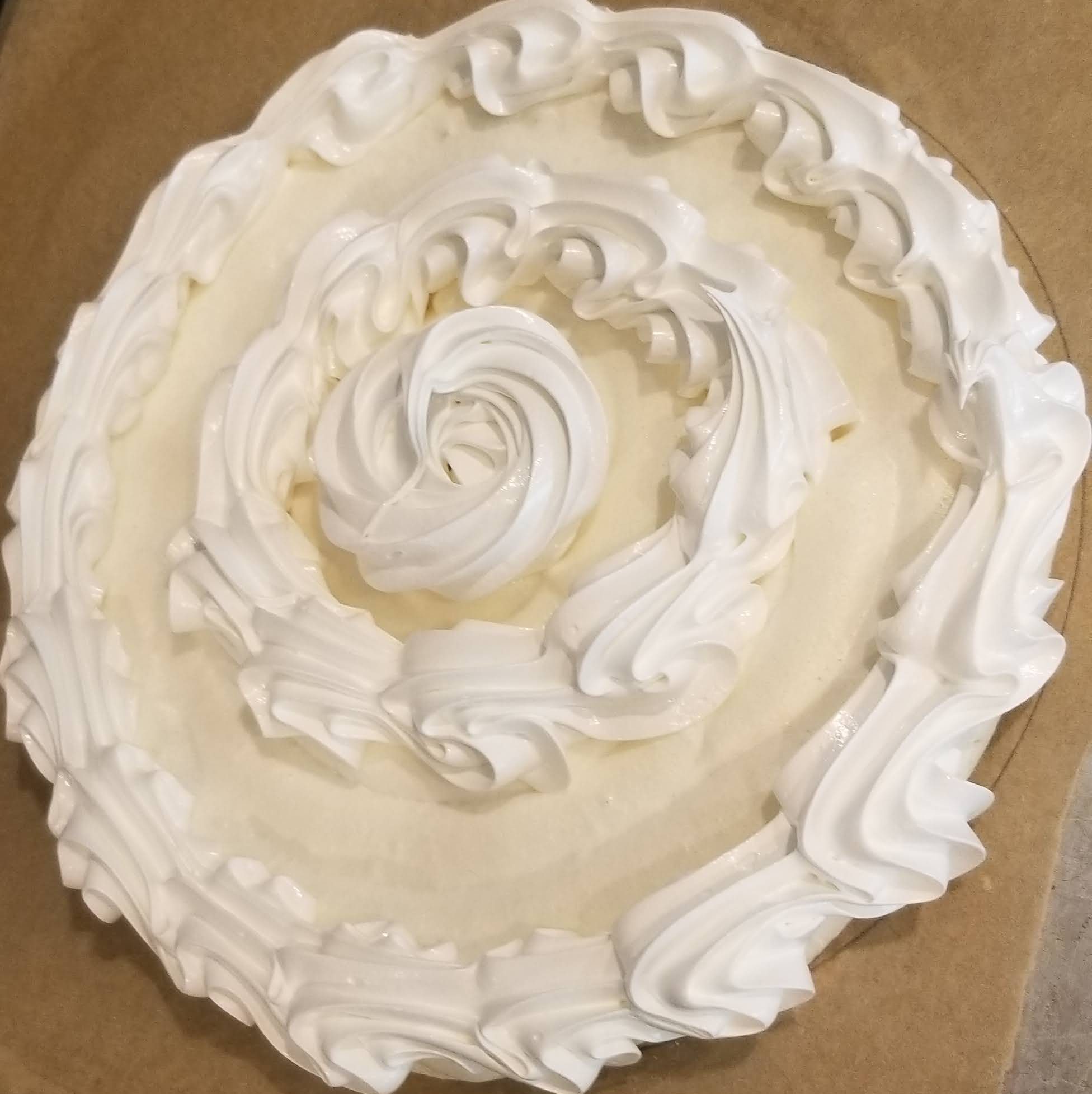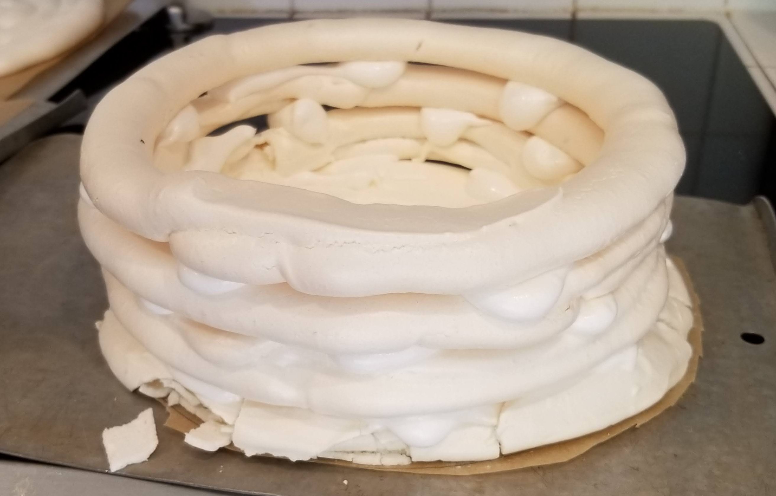 After these are baked and cooled, more French meringue is used to “glue” the rings, one on top of the other, onto the base. Then the entire shell is covered with meringue and baked again. Once this is cooled, Swiss meringue is piped decoratively all around the torte and on top of the lid, both of which are baked again to set the meringue.