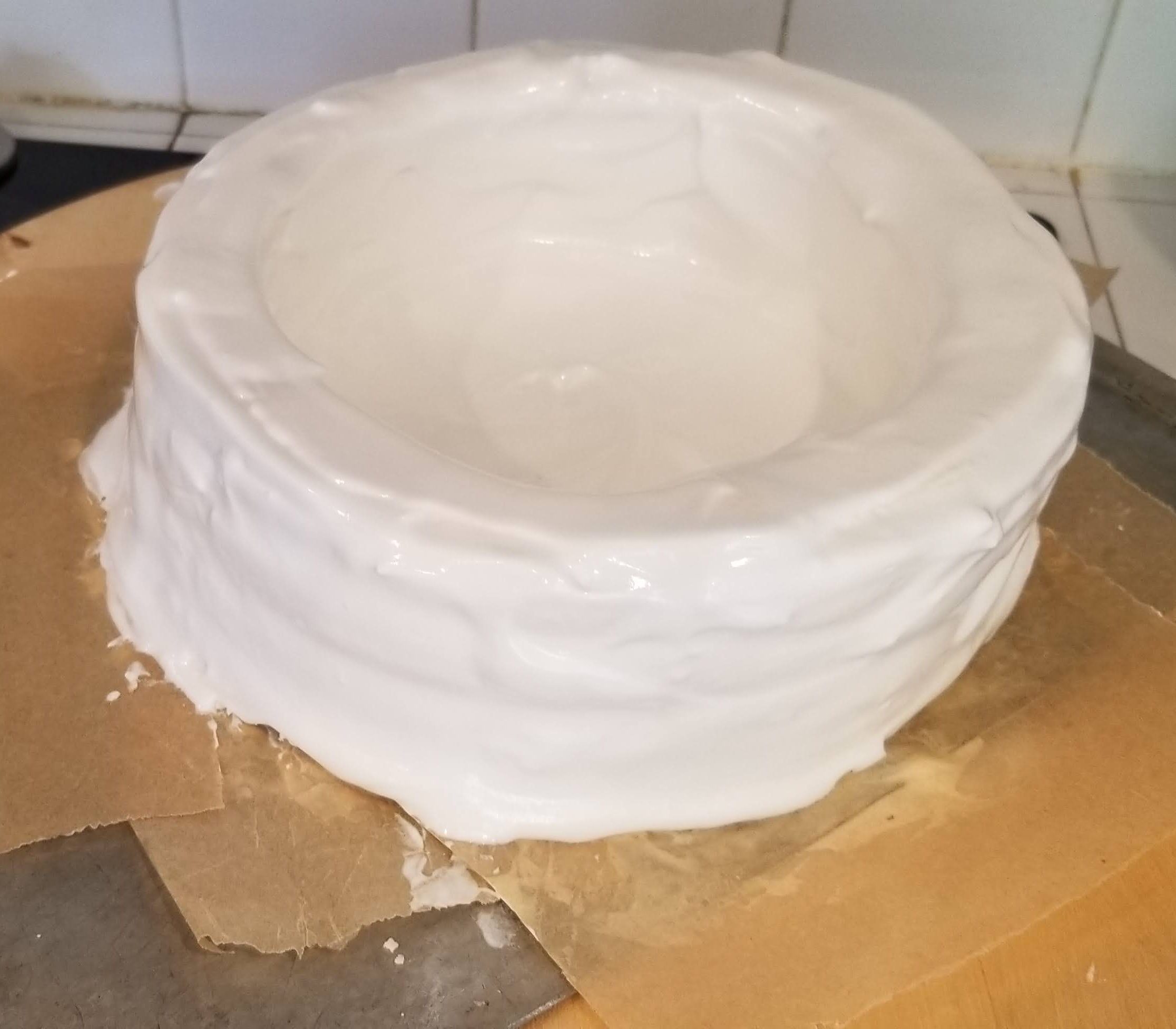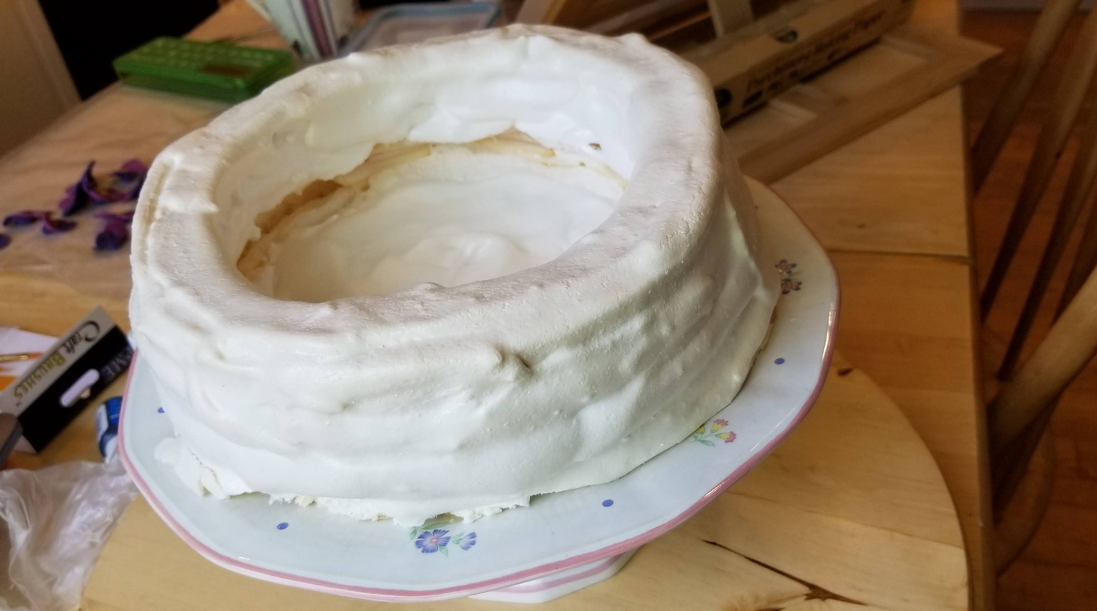 - Roughly pipe the remaining meringue around the sides of the torte to cover the rings. Use an offset spatula to smooth out the meringue so the sides are smooth and straight like a cake. (I had enough meringue to cover the inside, as well.) Bake on the serving plate (or baking sheet) for 45 minutes. Then remove from oven and leave to cool.