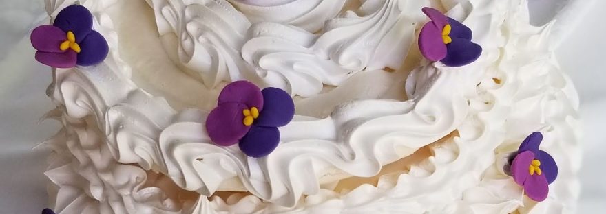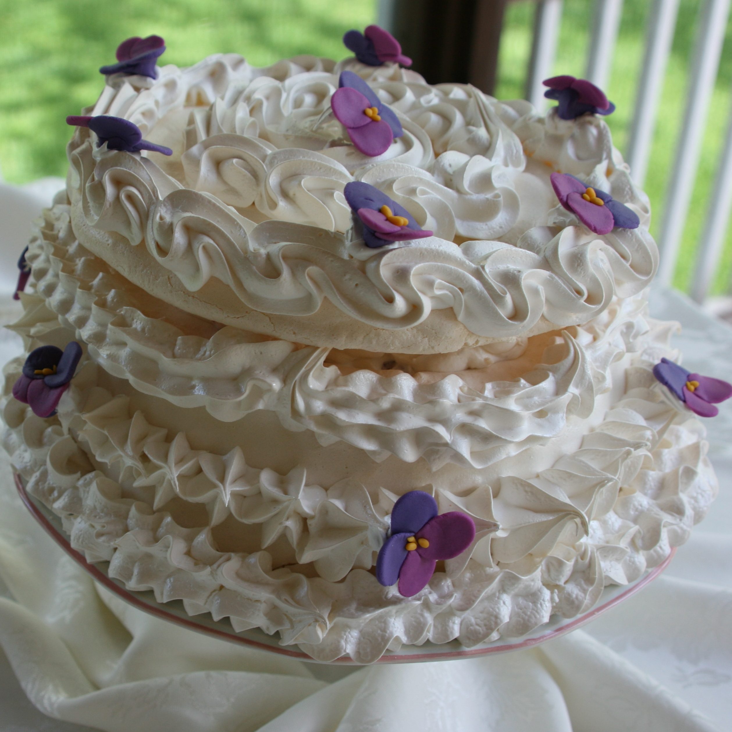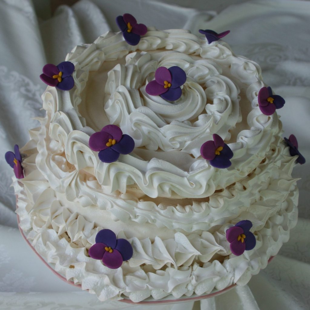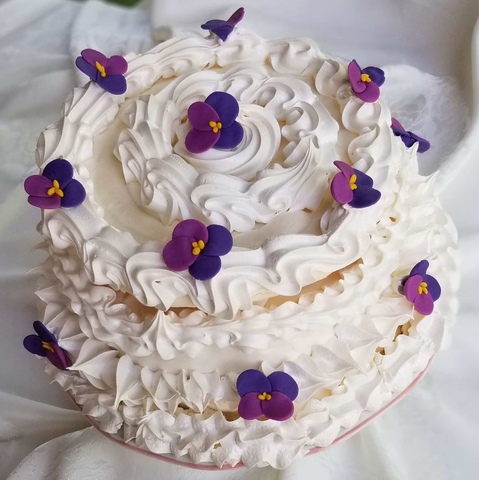- Use tiny blobs of leftover meringue to stick six violets around the middle piped border on the side of the cake, six violets around the edge of the lid and one violet in the center of the lid.