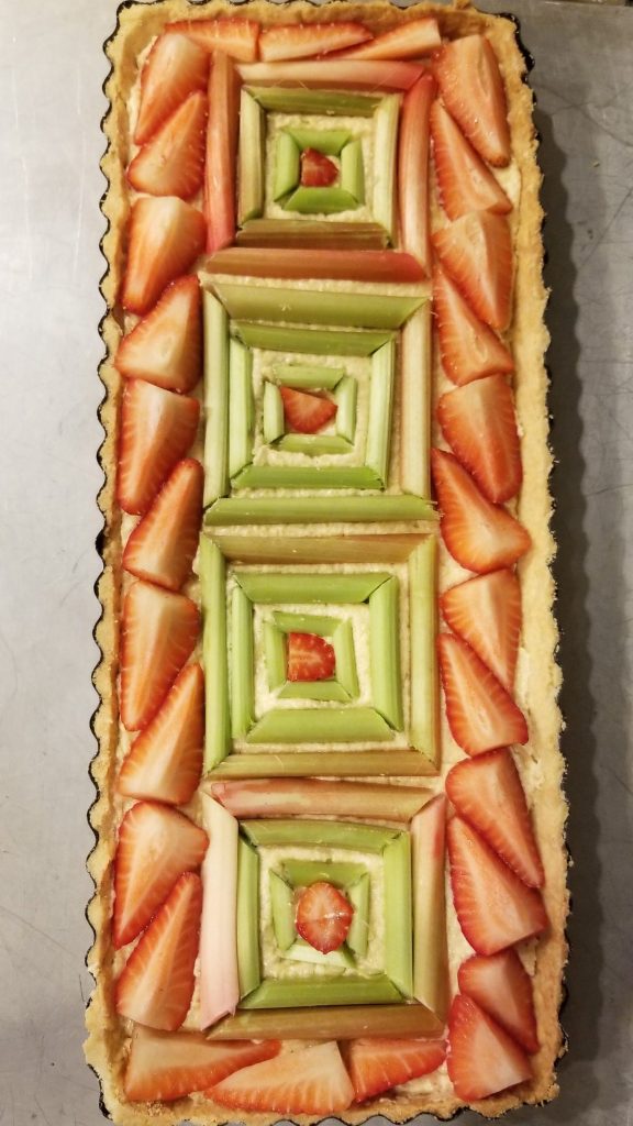 To assemble the tart, I spread a thin layer of jam over the cooled pastry shell. Then I spread the frangipane over that, using an offset spatula to make it as smooth and even as possible. I then arranged the fruit on top. I was making a rectangular tart, and my rhubarb stalks were pretty thin, so I created a pattern of rhubarb squares surrounded by a border of quartered strawberries with a small strawberry slice inside each square. I was pleased that the pattern held up well during baking, and because my rhubarb is green, not the appetizing red you see in pictures of most rhubarb tarts, I glazed it with more warmed strawberry jam to give it a pinkish tint and a shiny finish.