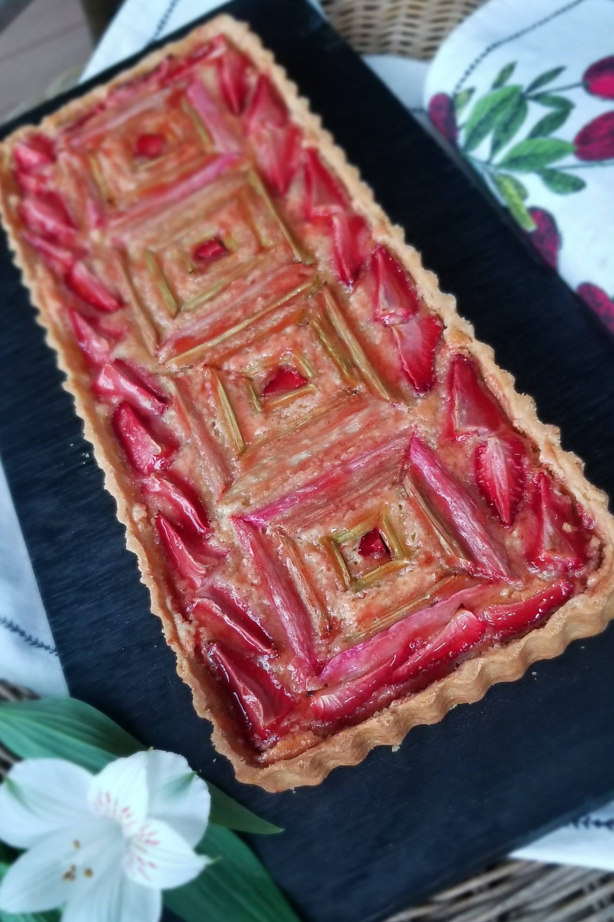 - Preheat oven to 350°F with rack in the middle position. Spread cooled pastry shell with jam. Spread frangipane over the jam, using an offset spatula to create a smooth and even layer. Arrange strawberries and rhubarb over the frangipane in desired pattern, pushing them into the mixture slightly.