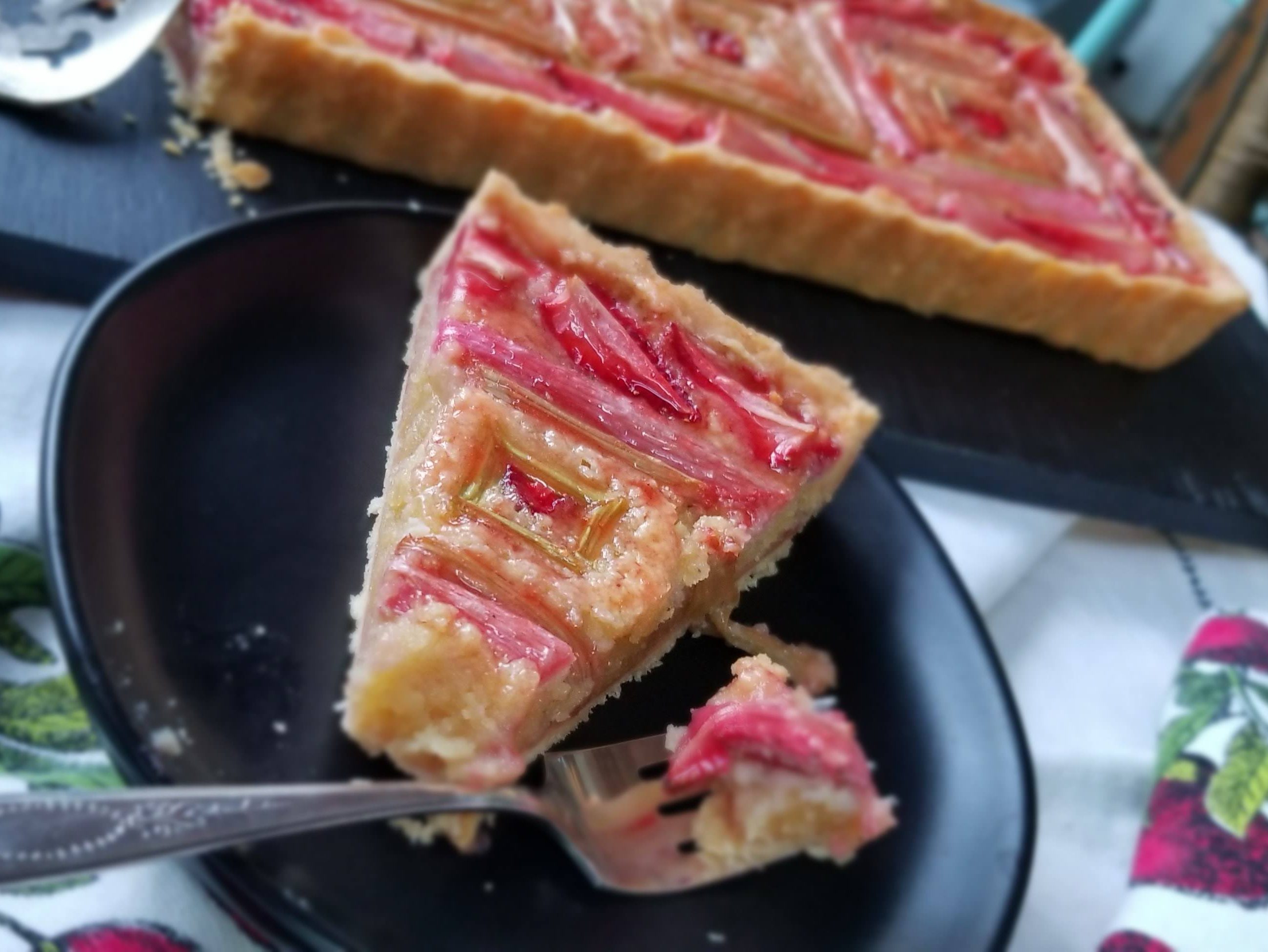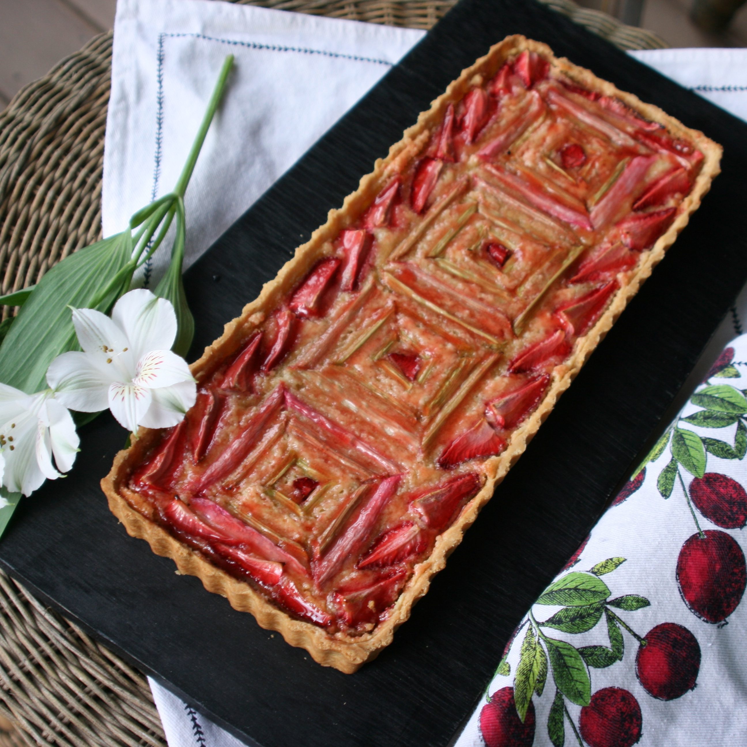 I love frangipane, and the combination of almonds with strawberries and rhubarb tastes like a summer afternoon having tea in the garden, surrounded by almond blossoms and fruited vines. The elements of this tart are very versatile, so if you decide to make it yourself, feel free to switch out the fruits and jam with any combination that is in season and suits your fancy.