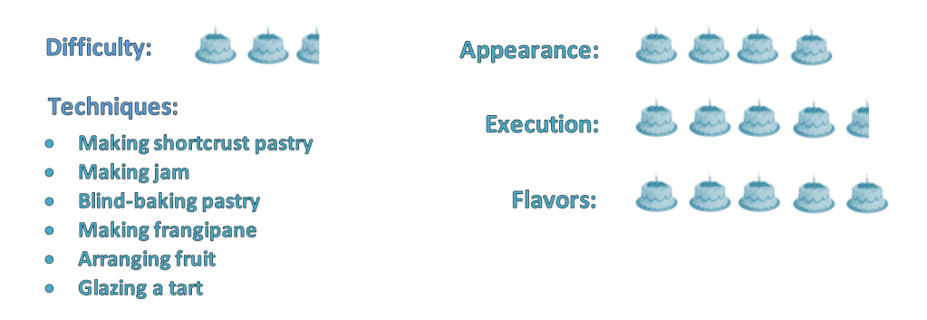 The brief for this challenge was to make a tart with shortcrust pastry and an open top. The judges were looking for “mouthwatering frangipane,” “full-flavored fruit“ and, as always, no soggy bottom!