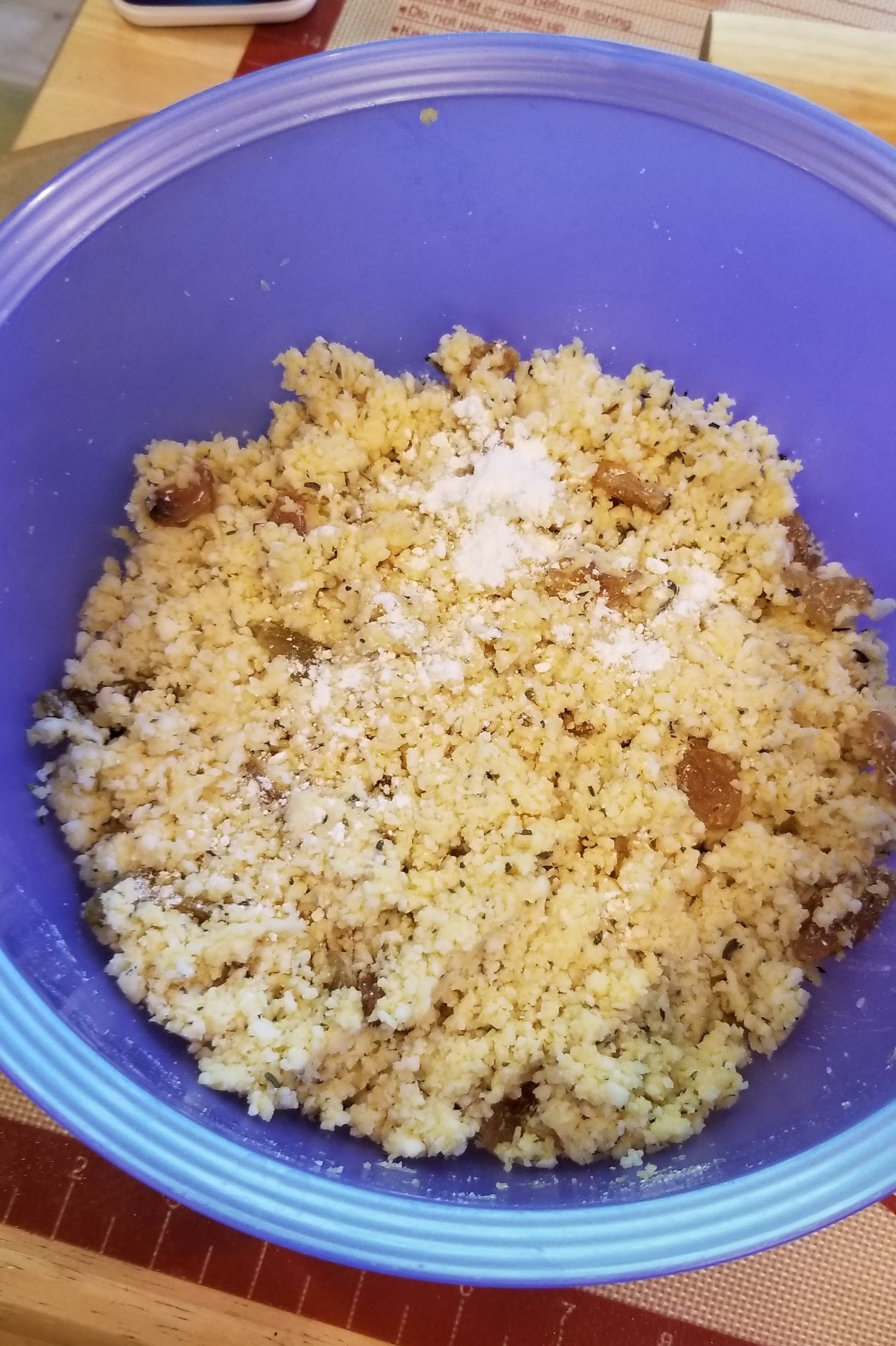 - Tip the flour mixture over the cheese and then pour the egg mixture over all. Mix lightly with your hands until well-combined. Cover and leave to stand while you make the pastry.