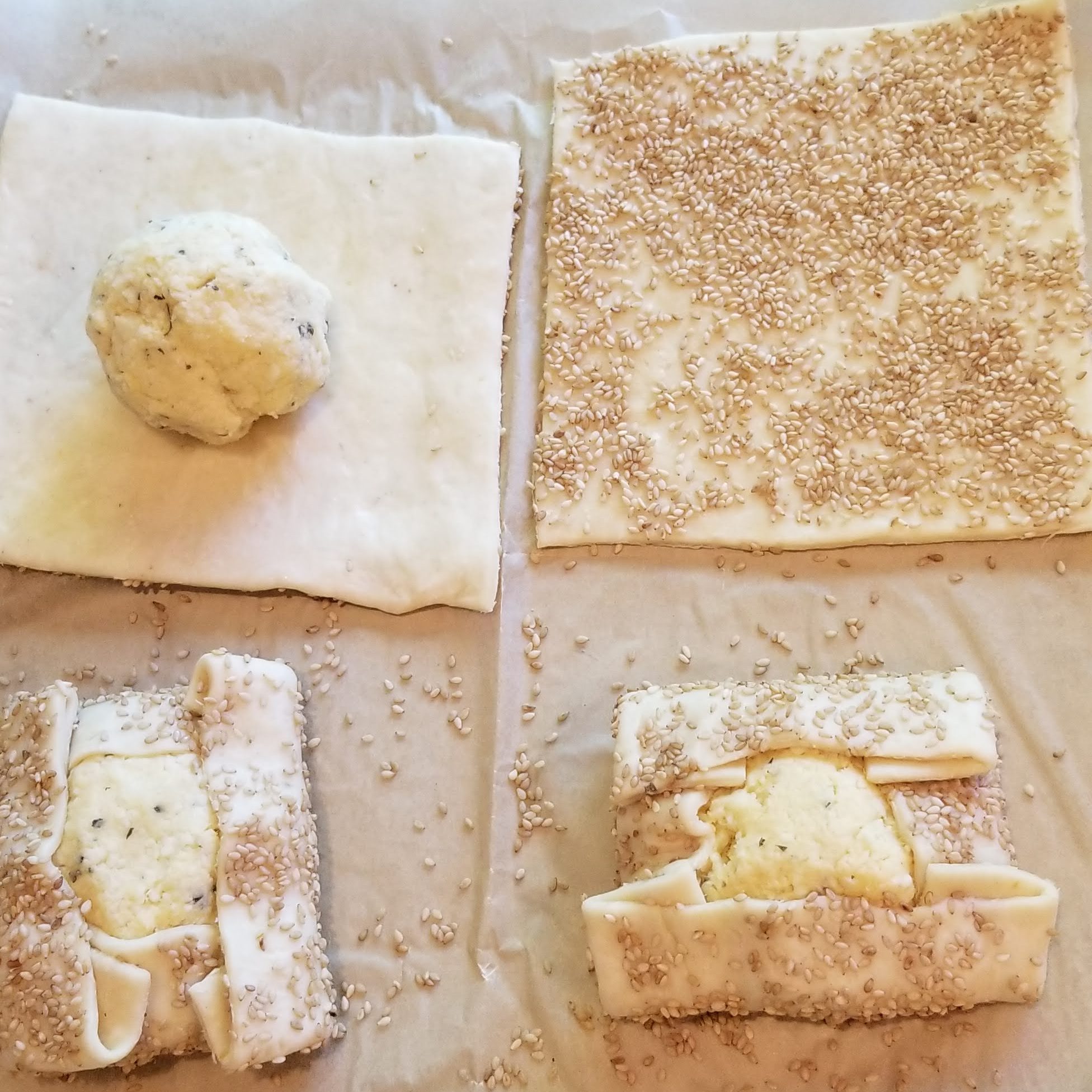 - Divide the pastry in half and roll out one half at a time on a lightly floured surface until about ⅛-inch thick. Cut a 6-inch square out of cardboard to use as a template. Cut each half of the dough into 6 squares. Firmly press one side of each square of pastry into the sesame seeds to coat. Place on the prepared baking sheets, sesame seed side down.