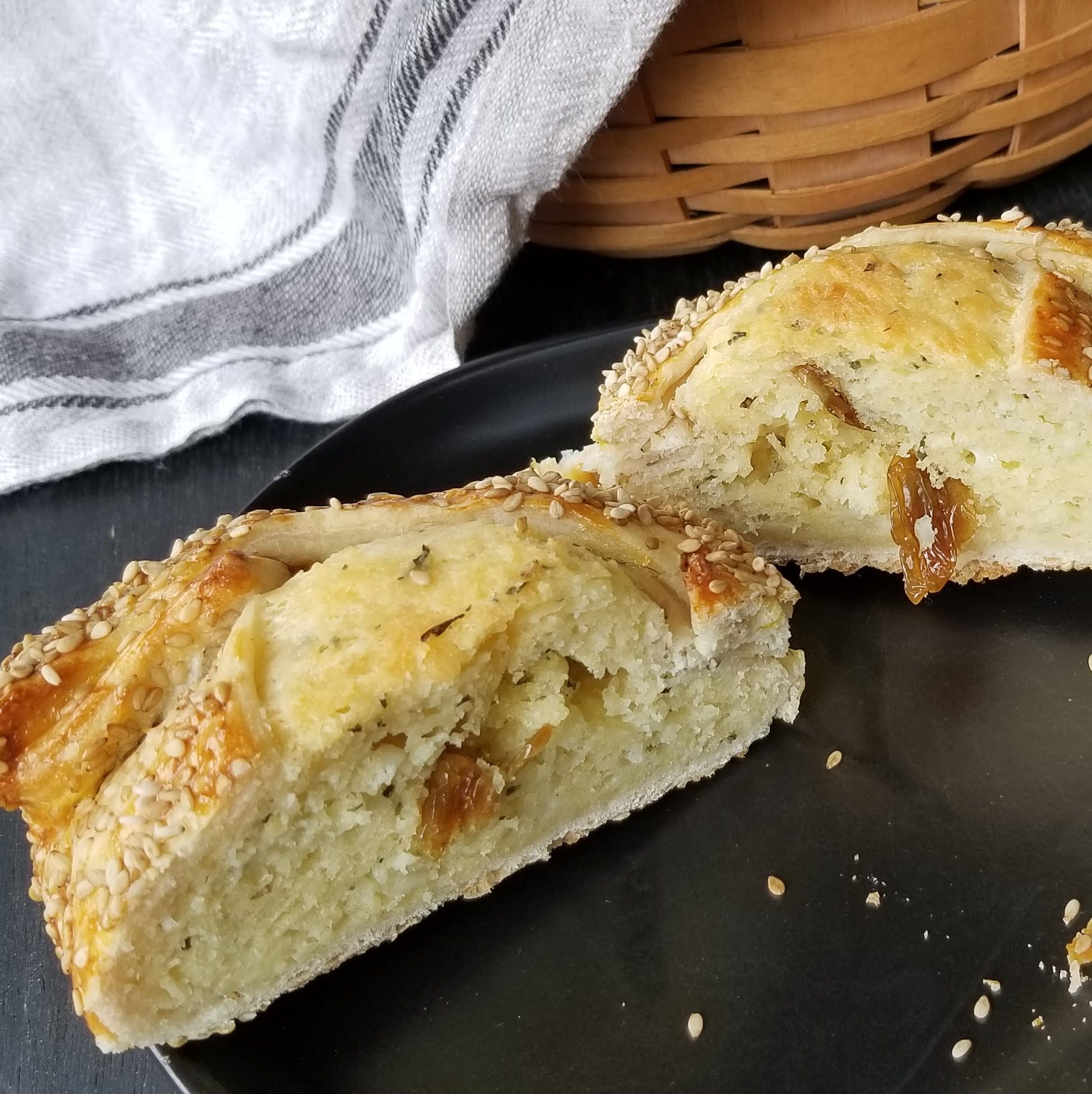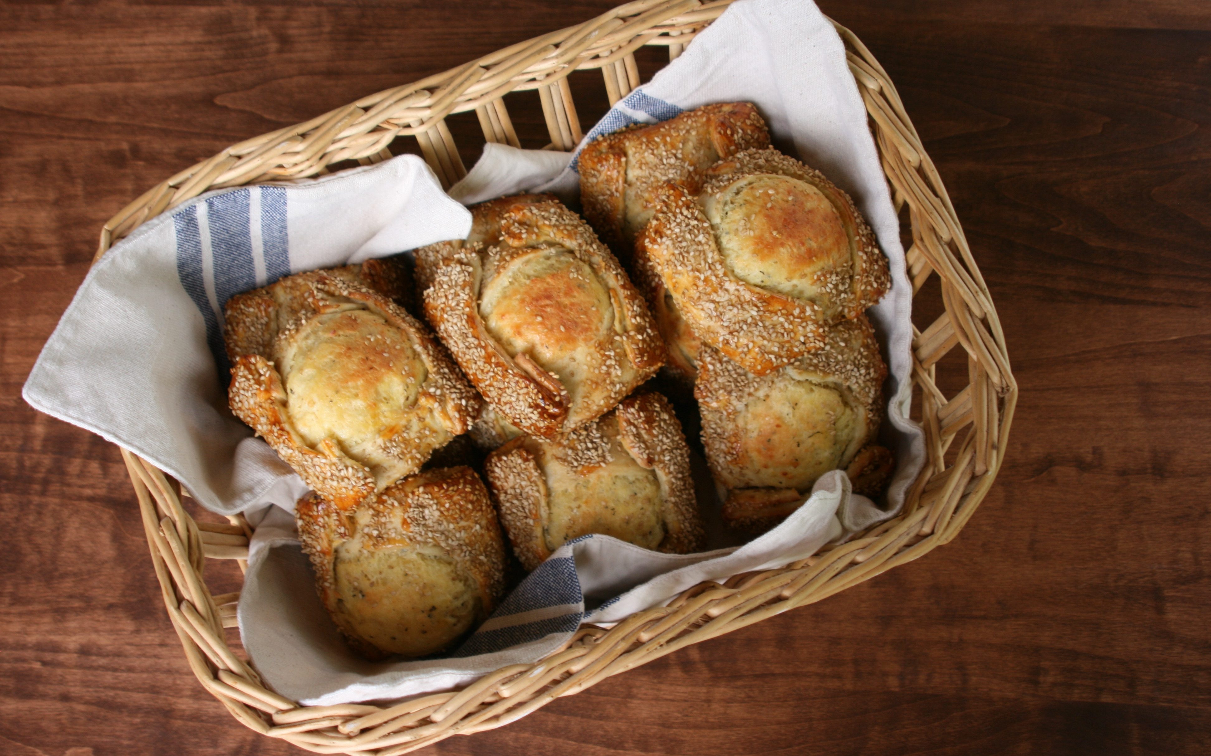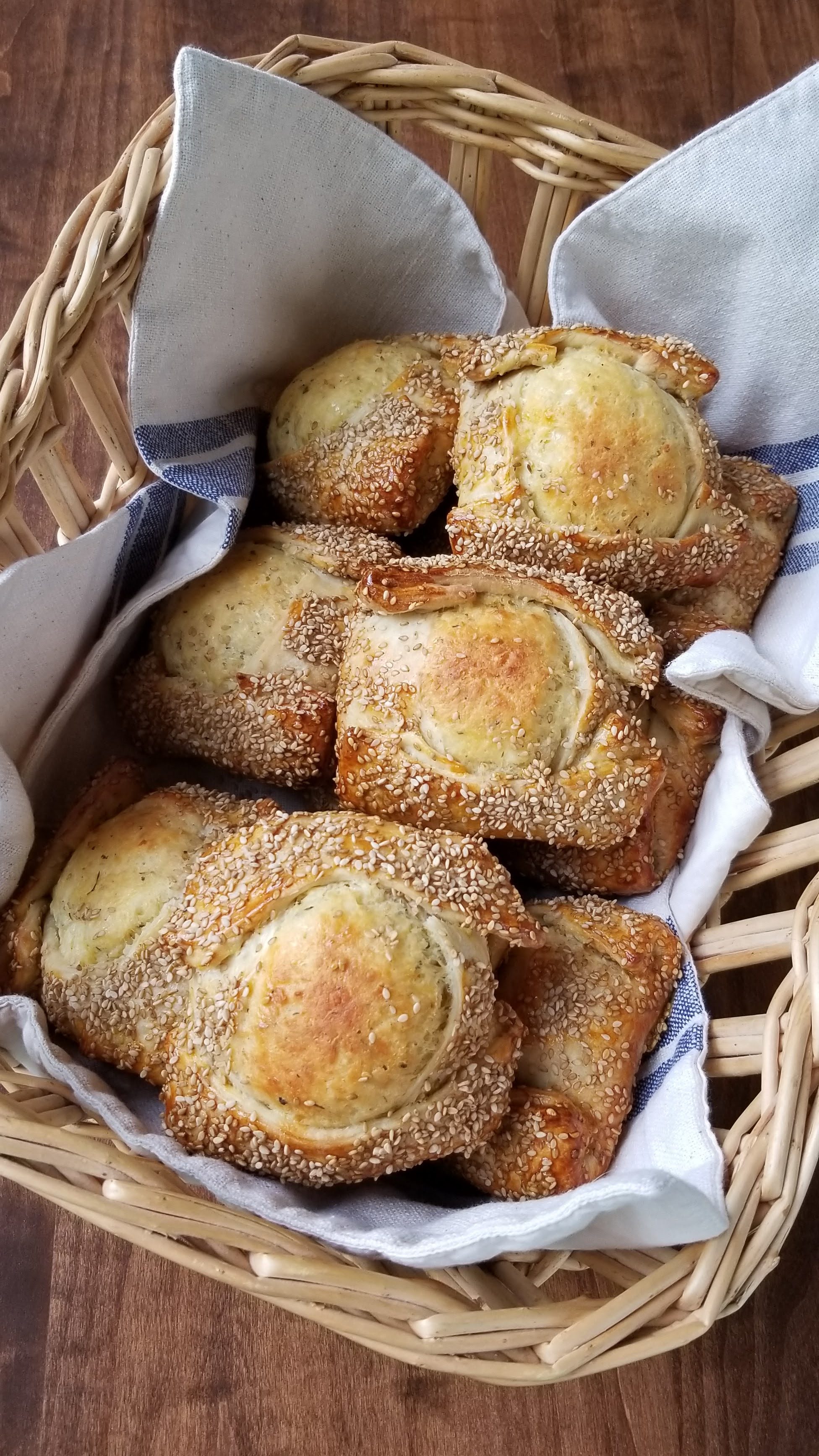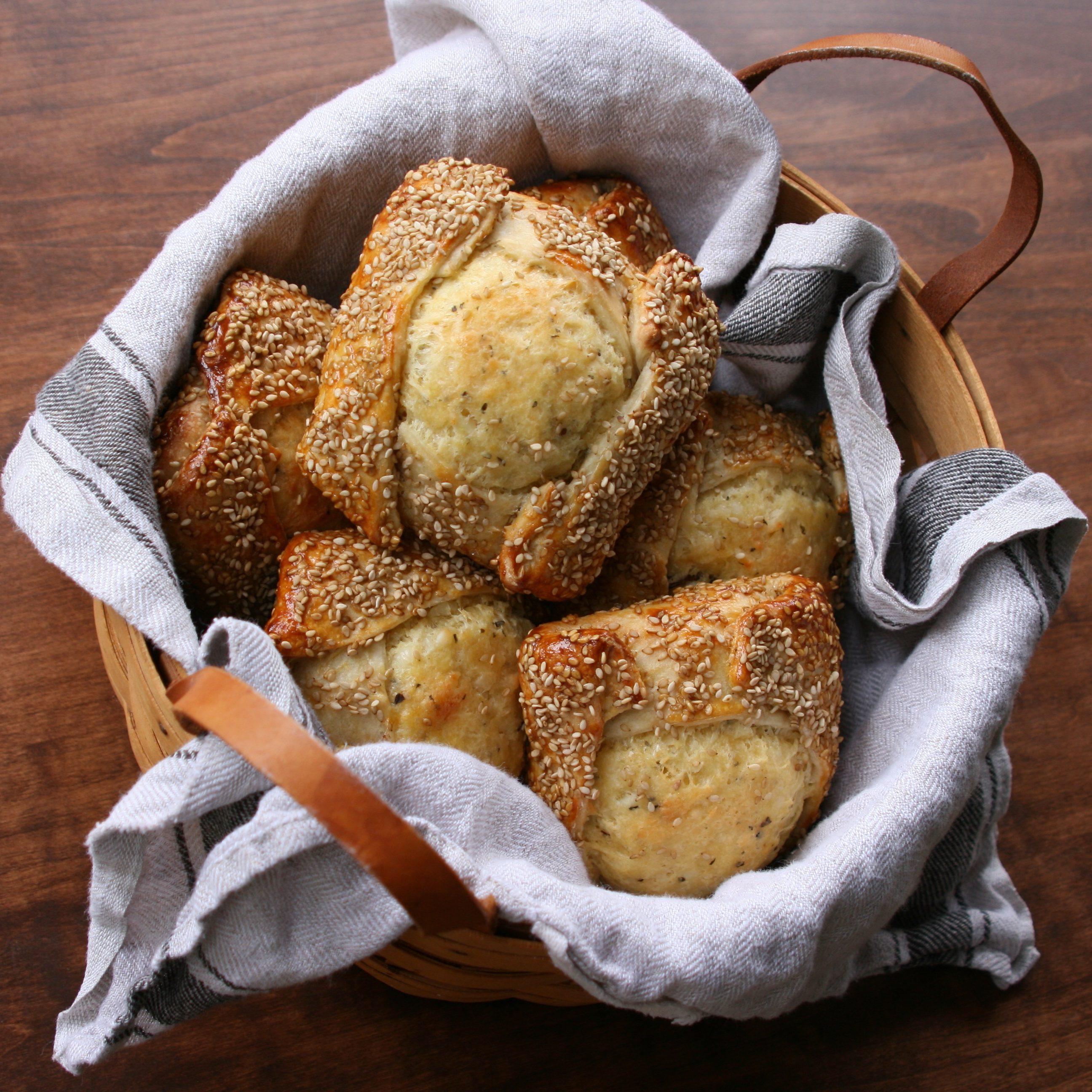 As they bake, the cheesy filling puffs up and expands upward, so the end result looks like a rather large, sesame-covered bun stuffed with a golden mound of flavorful cheese that is studded with plump raisins. The cheese is sharp and salty, but the raisins give your tastebuds a burst of sweetness when you bite into one. If I make these again, I will increase the raisins to up the sweet-salty factor. I couldn’t really taste the mastic and the mahleb, since the cheese overpowers the rest of the flavors, but I used my leftover dough to make breadsticks, and I could definitely discern that slightly fruity, slightly floral aromatic flavor in them.