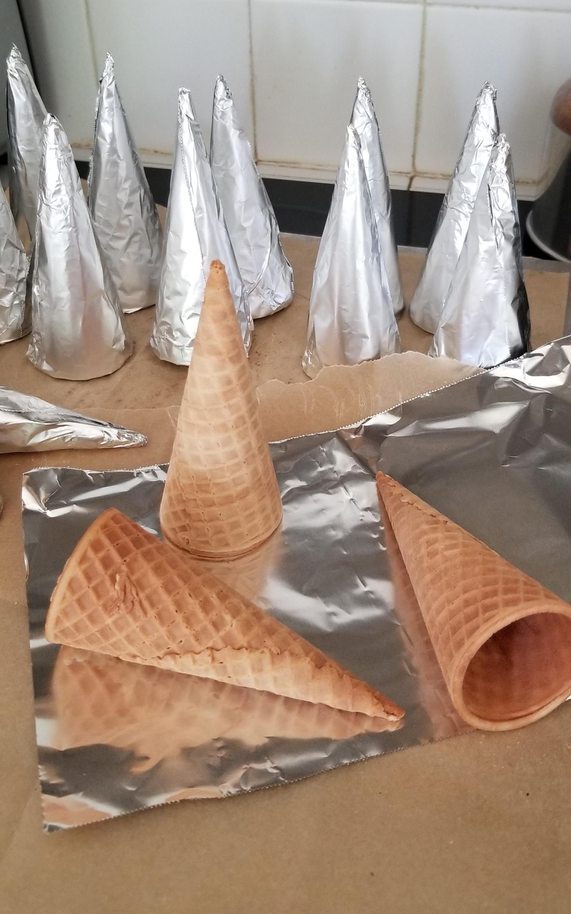 - First, if you don’t have cream horn molds, wrap each of the ice cream cones in foil and grease them lightly. (I used Nancy Birtwhistle’s lining paste.*)
