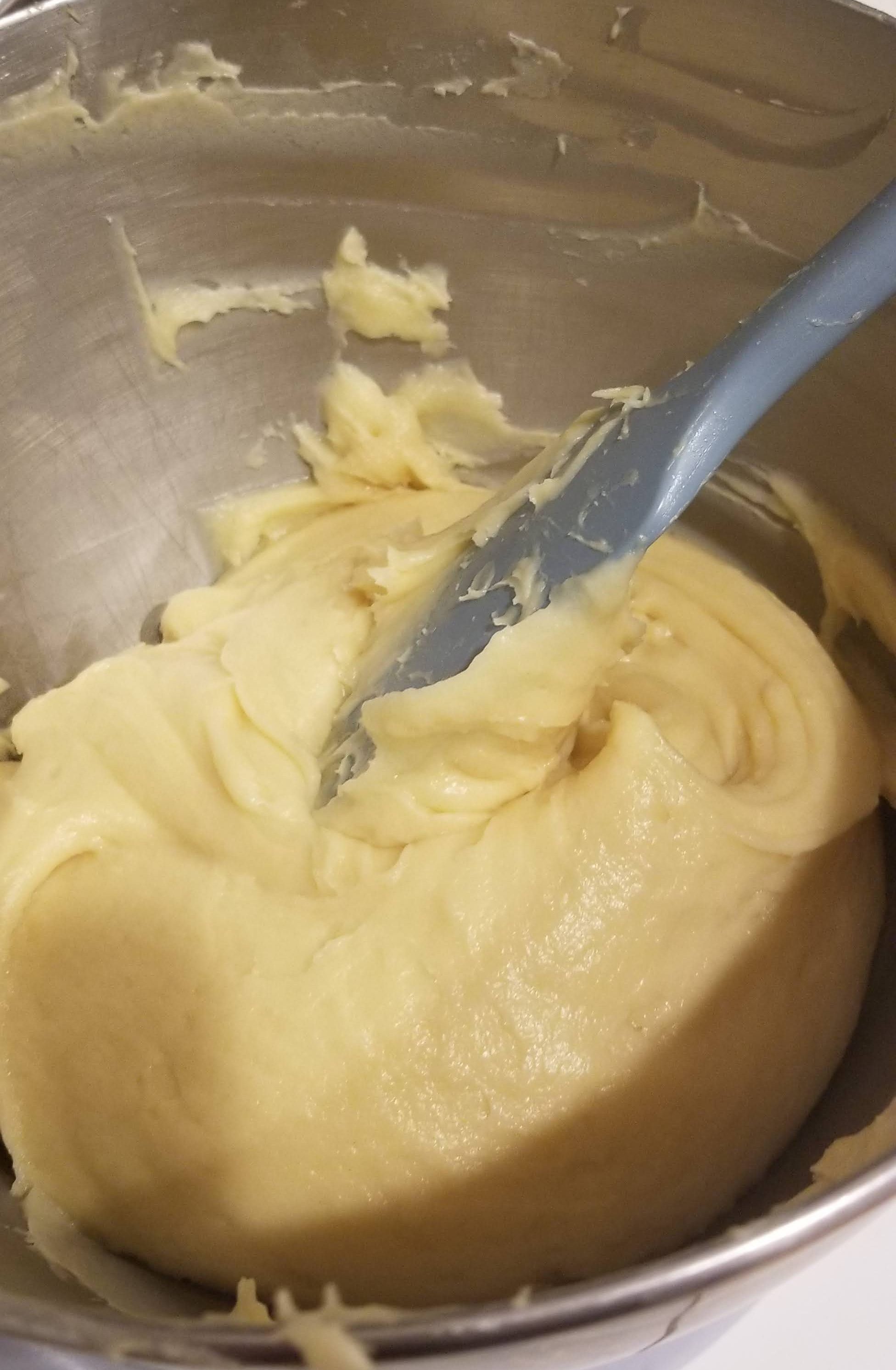- Add the eggs a little at a time, beating vigorously the whole time. The dough will become stiff and glossy. Check the consistency of the dough after each addition. The dough should be glossy and pipeable but thick enough to hold its shape. When you drag your finger along the surface, it should create a trough that stays upright and doesn’t collapse. Also, when you scoop some up with a spatula, it should fall in a V shape from the spatula. If, after adding all 4 eggs, the dough still seems too stiff, whisk up another egg and add a little at a time, being careful not to let the dough get too runny.