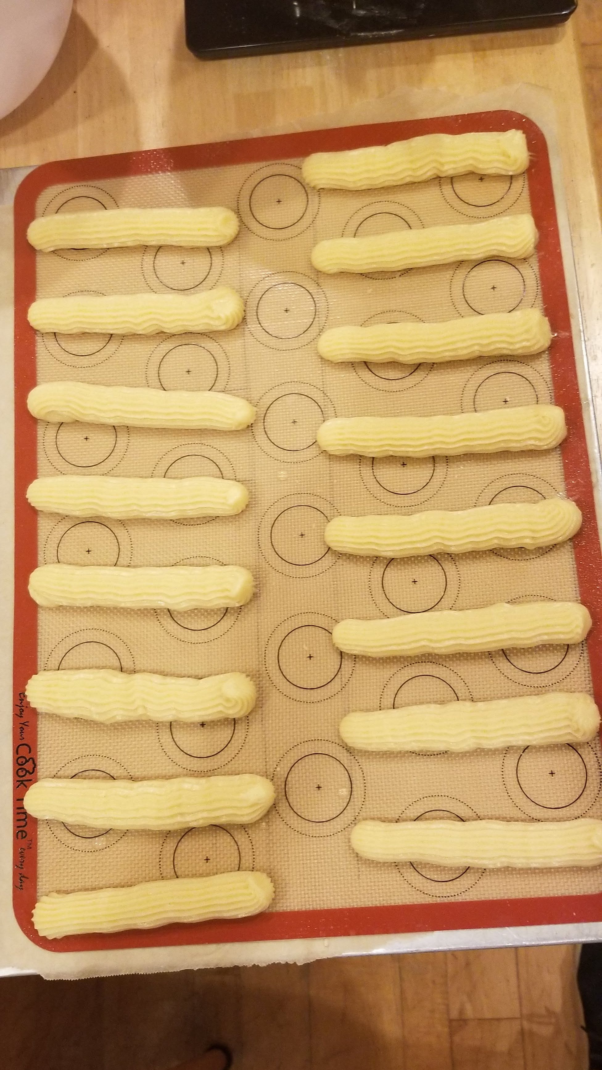 - Spoon the mixture into a piping bag fitted with a ½-inch French star nozzle. Pipe éclairs onto the silicone mats, using the templates drawn on the parchment. Keep the pastry bag at a 45-degree angle to the baking sheet, with the piping tip touching the surface. Maintain consistent pressure on the bag, but make the ends of the éclairs slightly larger than the middle. Twist the bag at the end of each éclair. Lastly, fill the circles drawn on the parchment with dough, holding the piping bag directly above the circles so the tip is slightly embedded in the dough. Use a moistened finger to tamp down the peaks at the ends of the éclairs and the tops of the circles. Dust the choux dough with powdered sugar before baking.