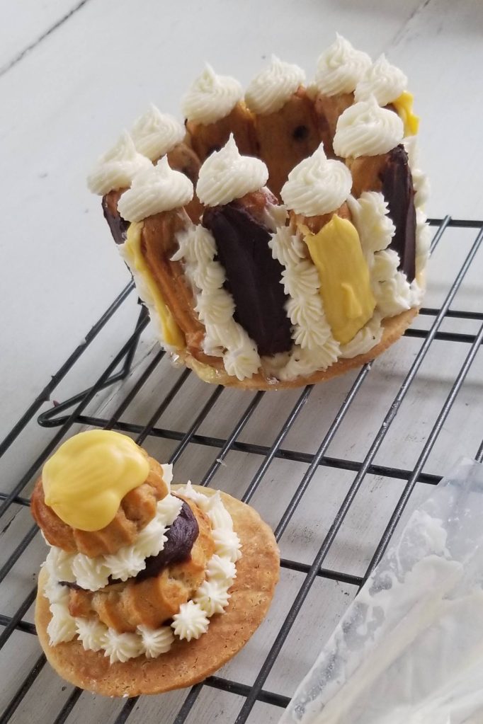 - Pipe a small mound of buttercream on top of each éclair, then stack the tiers together. Then pipe buttercream around the edge of each pastry disk and in the gaps between the éclairs. Pipe around the bottom of each of the cream puffs to create a fluffy white “collar.”