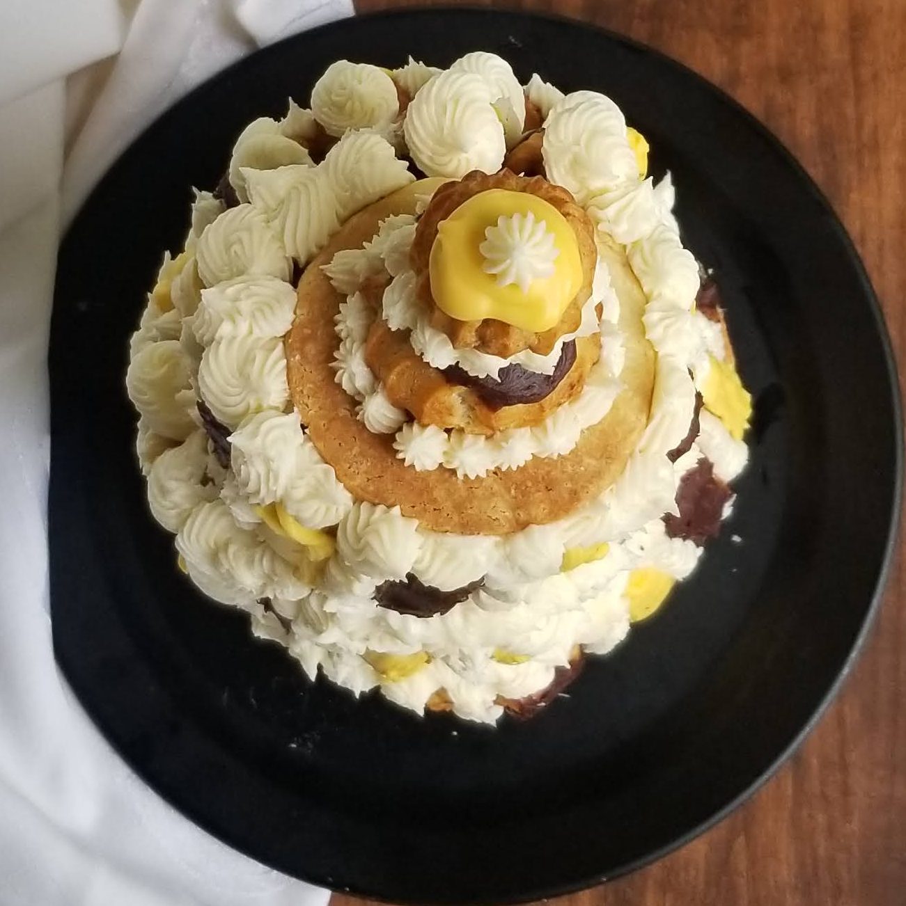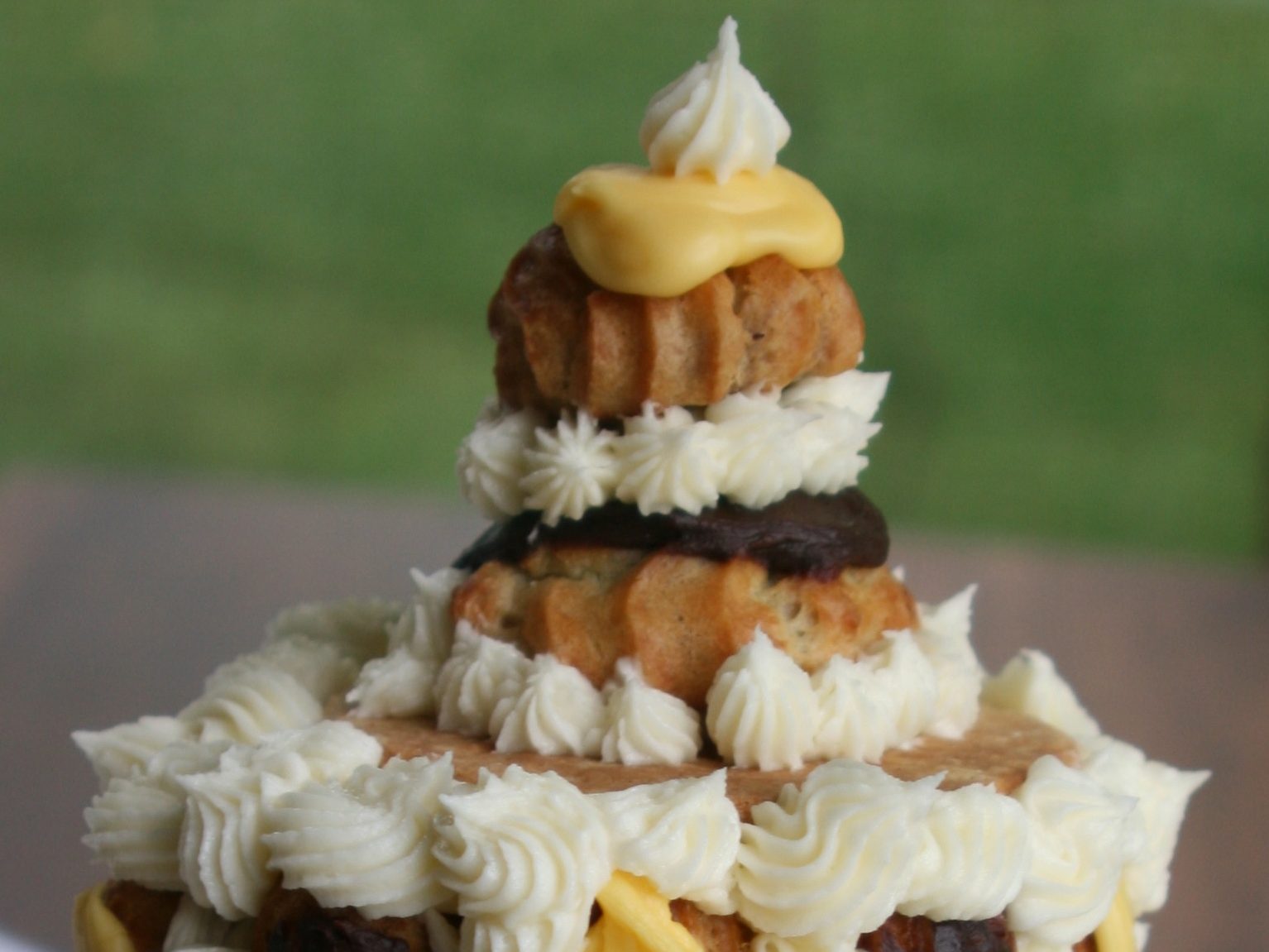 - Finally, stick the large choux bun to the smallest pastry disk and the small choux bun on top of it. Leave the tiers to set while making the buttercream.