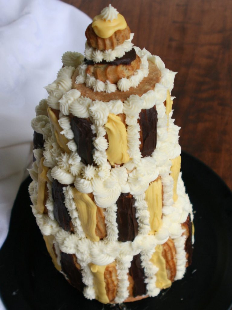 When it came time to stack the layers, I discovered another problem. Because the diameter of each shortcrust base is smaller than the one below it, the éclairs need to lean in slightly. Mine didn’t lean enough, so the bases balanced precariously on top of the éclairs. Especially the top tier. Also, I didn’t trim the tops of the éclairs to make sure each layer would be level — unlike some of the Bake-Off contestants, who used a level to make sure their tiers were perfectly even — so my religieuse a l’ancienne looked a lot like the Leaning Tower of Pisa.