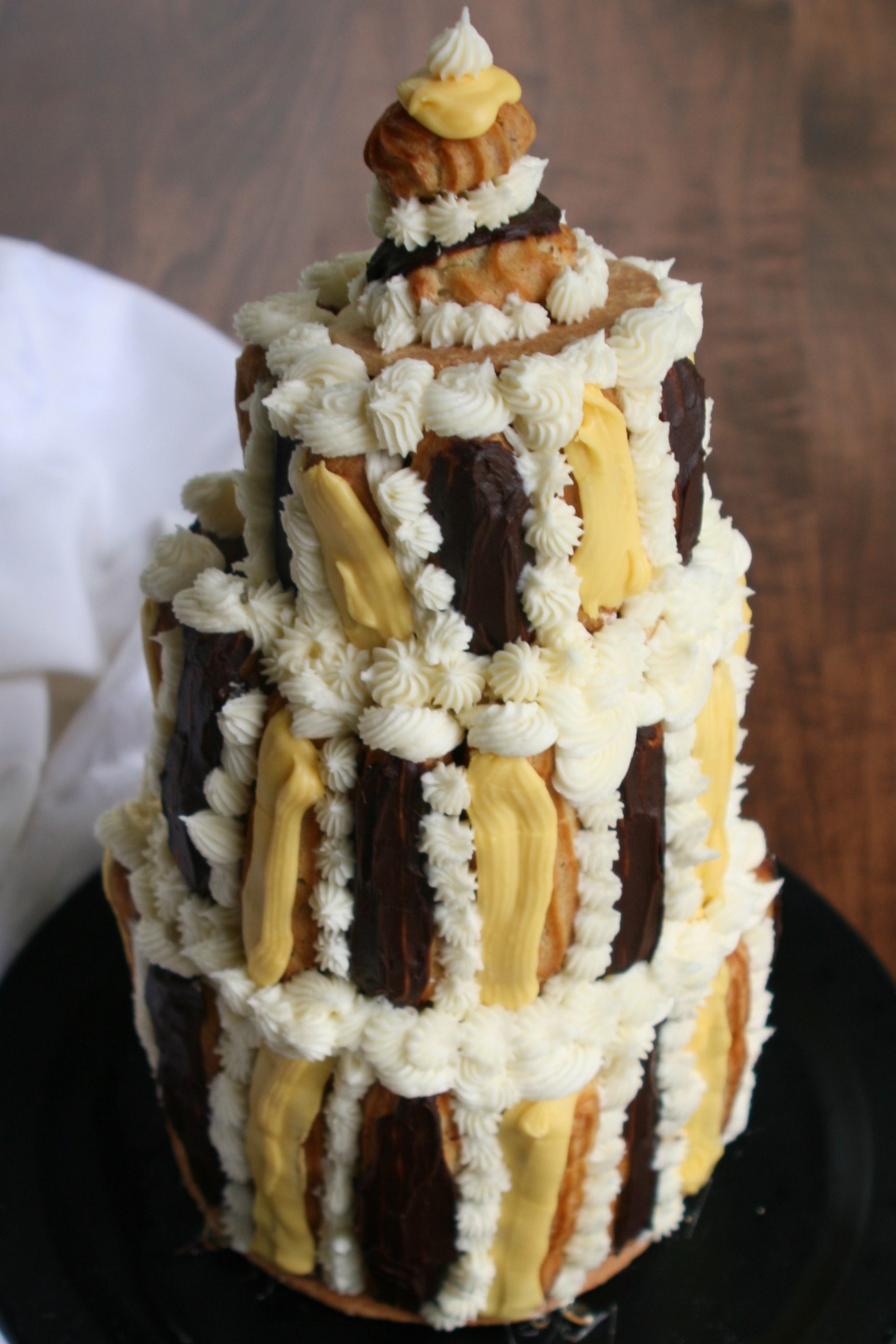 The hardest part, as expected, was assembling the tower. I made the caramel and started assembling the bottom tier. By the time I finished that part, the caramel was hardening in the pan. Paul’s recipe says to rewarm it gently, but when I put it back on the stove, it just crystallized. So I made a second (half) batch. That got me through the second tier before it crystallized, as well. So I made a third (quarter) batch. I didn’t quite finish the third tier when that caramel hardened also. I was done with making caramel, so the last few éclairs were attached with buttercream instead.