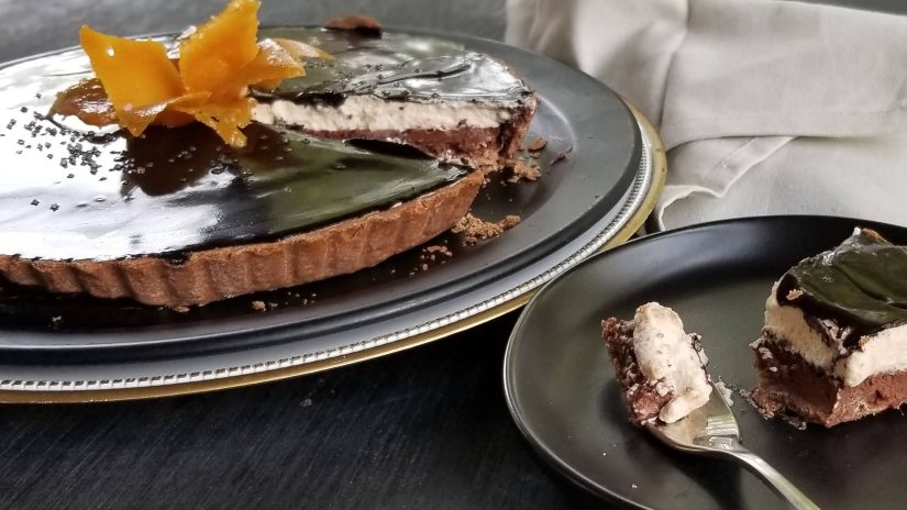 To add interest, and up the flavor profile, I included a layer of salted caramel mousse, the recipe for which comes from the same blogger. After adding the mirror glaze, I garnished the tart with caramel wafers, like Flora used to decorate her cream horns, and sprinkled it with some coarse sea salt for that occasional burst of saltiness that makes any chocolate and caramel that much extra.