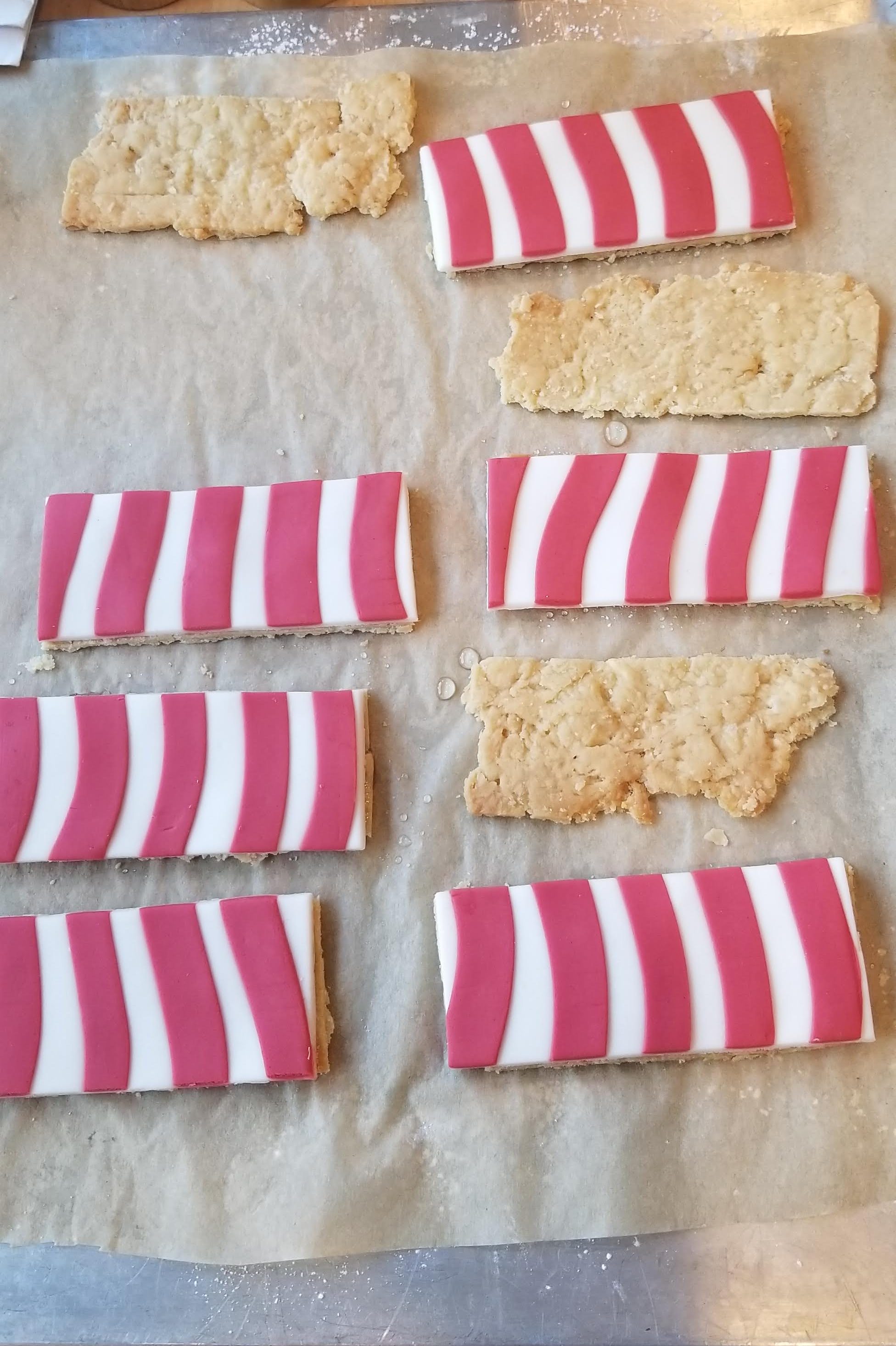 • On each of the remaining six rectangles, brush the sugar syrup onto the surface and place a rectangle of striped fondant on top.