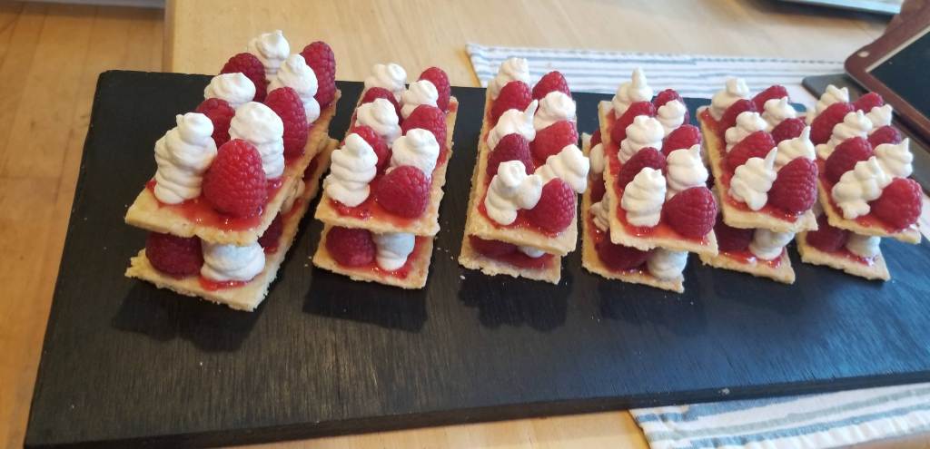 • 60 raspberries (10 per individual millefeuille/5 per layer)