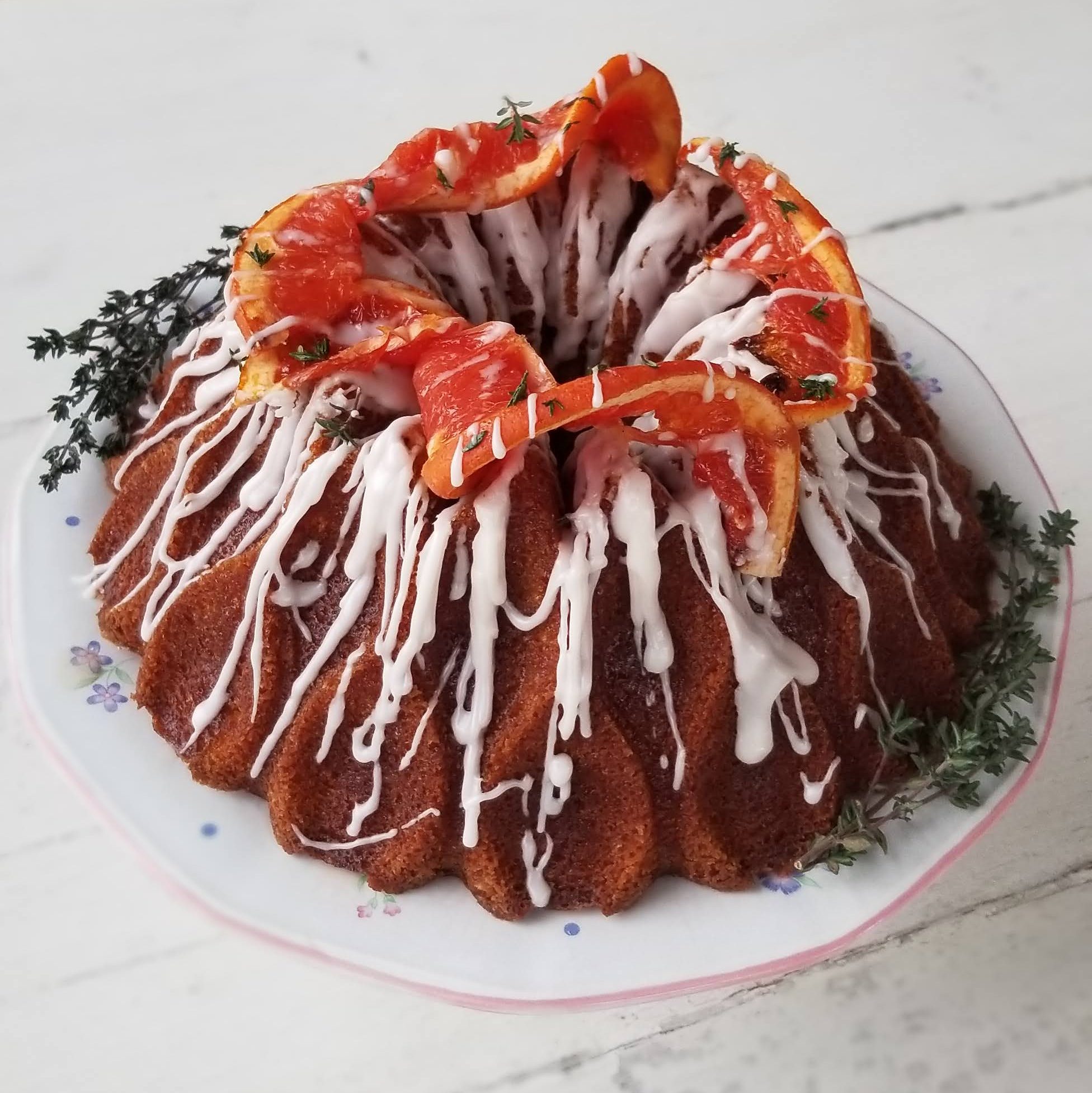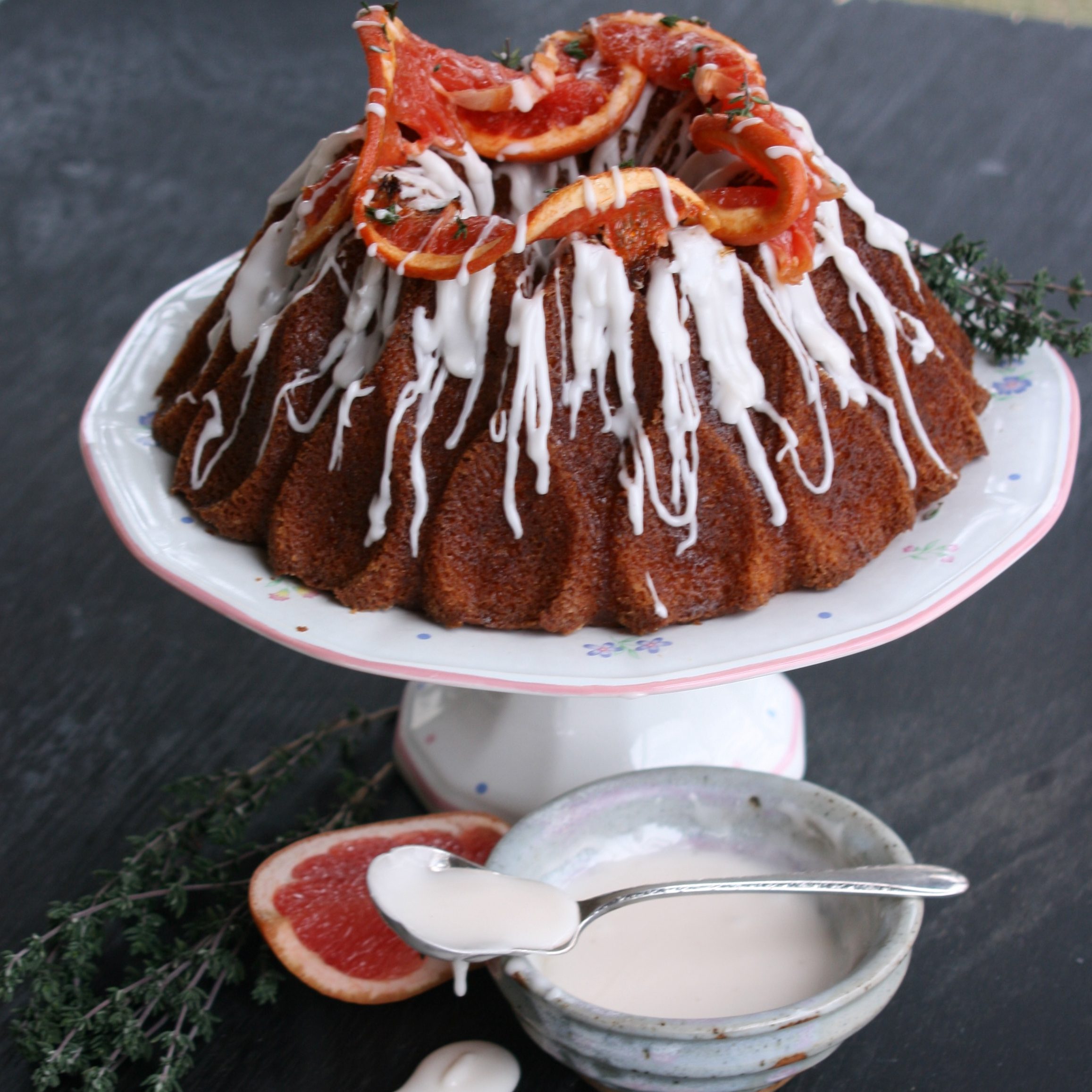 - To make the glaze, add reserved syrup to powdered sugar and mix until smooth. Drizzle glaze over cake and garnish with roasted grapefruit slices and thyme sprigs.