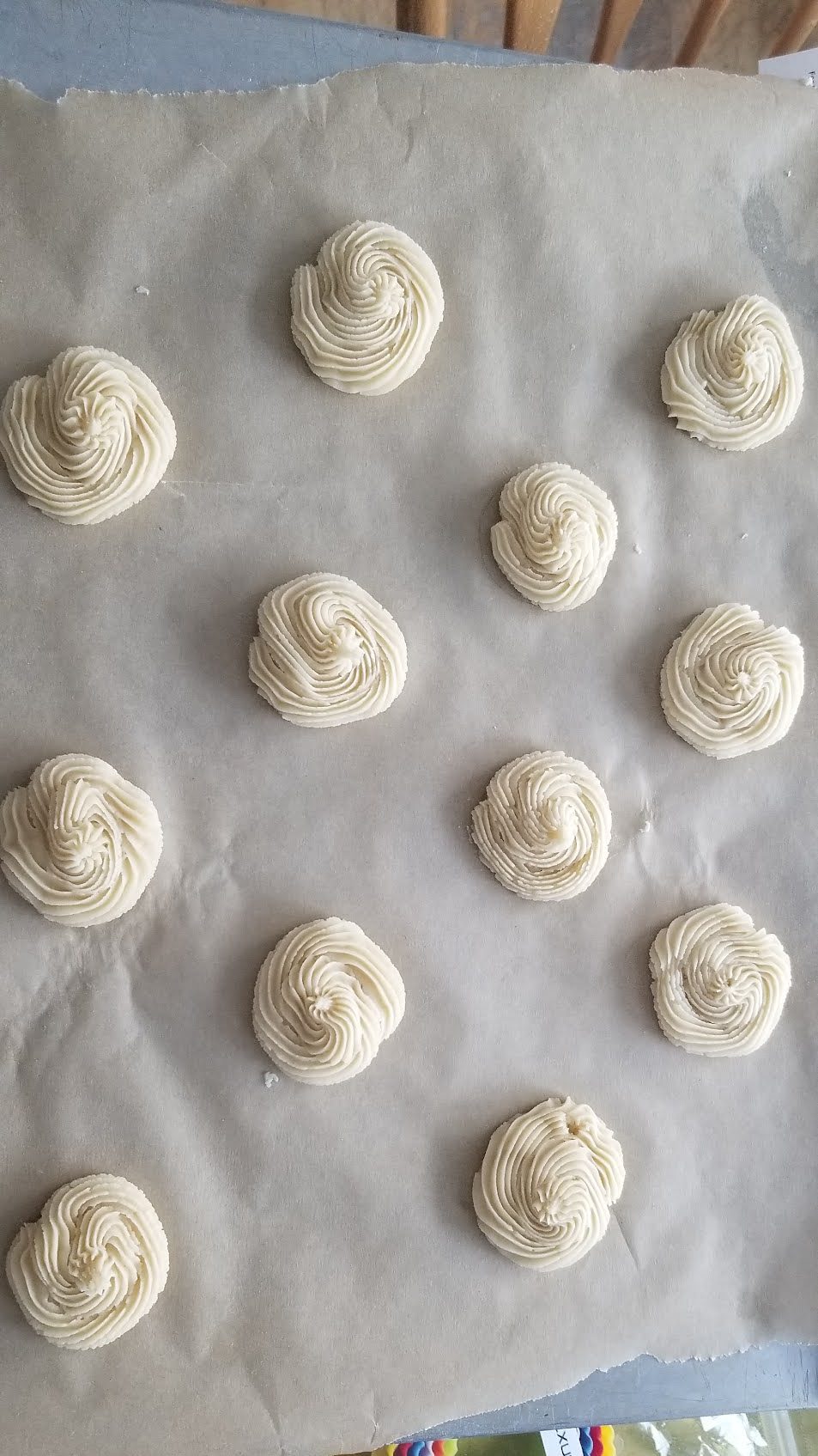 I wasn’t sure if I was supposed to pipe from the center of the circle outwards or from the outside in, but I checked out several videos online, and it really doesn’t seem to matter. You can even make them in a straight line, like fingers, or in a swirly zigzag pattern. Have fun with it!
