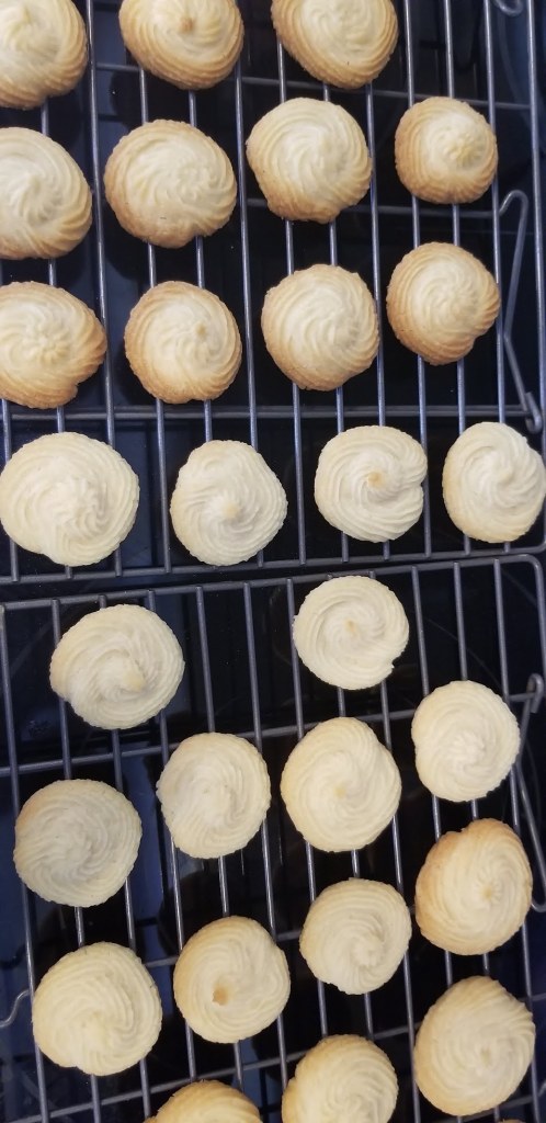Mary Berry’s recipe for Viennese whirls differs from my mother’s spritz cookie recipe in that it does not use eggs but does call for cornstarch in addition to flour, butter and powdered sugar. The addition of cornstarch makes the Viennese whirls very “short” — meaning crumbly and with a tender crumb. That’s what gives them that melt-in-your-mouth goodness!
