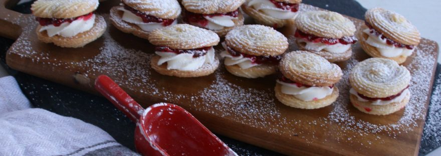Viennese whirls are very similar to Spritzgebäck, as well as spritz cookies, in that they are delicate and buttery. But rather than pushed through a press, they are piped into spiral shapes and, after baking, are sandwiched together with creamy buttercream and tangy raspberry jam.