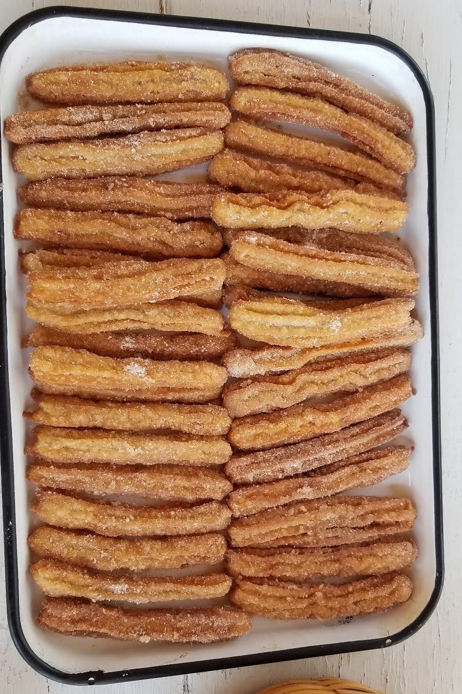 But first, a little bit of history. While the name is likely taken from the churra sheep that are native to Iberia (present-day Spain and Portugal) โ because they resemble the sheepโs horns โ their origins probably stem from China, where Portuguese merchants were introduced to youtiao, salty strips of fried dough usually eaten for breakfast. It is said that the Portuguese brought the idea home and innovated by adding sugar instead of salt. After that, legend has it, Spanish shepherds adopted the snack as their own, since they lived in the mountains for weeks at a time with no access to fresh bread.