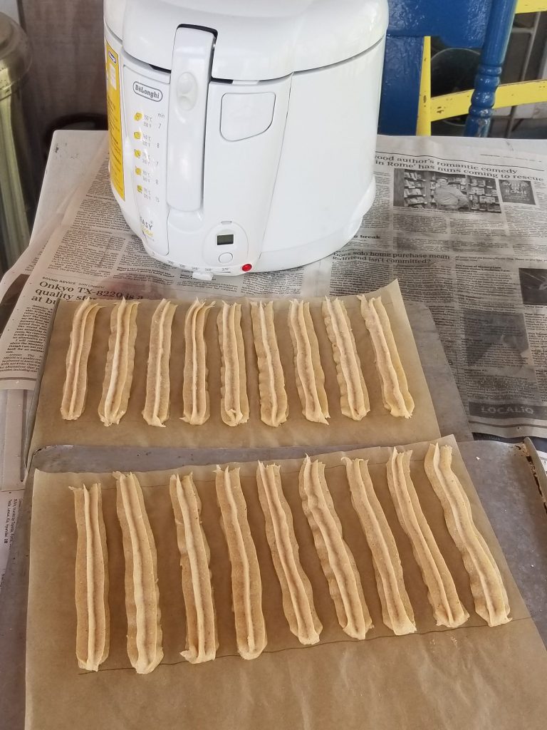 I chose to freeze mine first, and while they kept their ridges, they also ended up thin and crispy all the way through. No creamy center at all. I even tried lowering the oil temperature and undercooking them, but they still ended up crunchy. I decided to call them Crispy Churros Stix. However, after I made my first 36 churros, I had a little dough left over, which I piped directly into the hot oil, and they turned out slightly thicker, and therefore chewier, than the frozen ones.