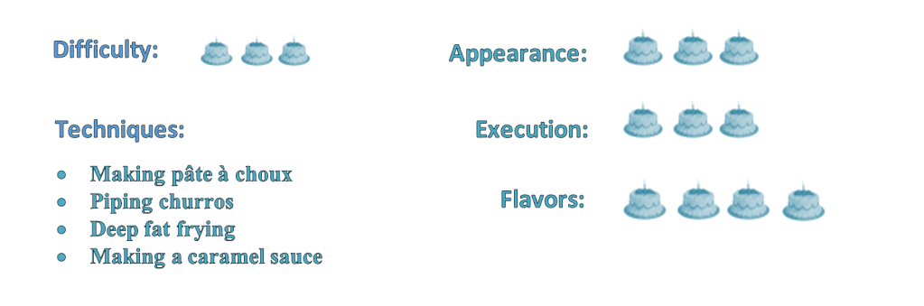 There was some discussion in the Great White Tent about whether the piped dough should be chilled before it was fried. Selasi was making churros cups and froze them before frying so they would hold their shape better. Val said she wanted hers to be as cold as possible without freezing to help them maintain their ridges. Kate chilled hers before frying in hopes that they would stiffen up, as her dough was thinner than she would have liked. Jane said she was not chilling her churros but let them stand at room temperature for a bit to let them “firm up a fraction.โ Tom and Rav took the traditional approach of piping their churros directly into the hot oil. Unfortunately, itโs almost impossible to get them uniform that way, which is something the judges were watching for.
